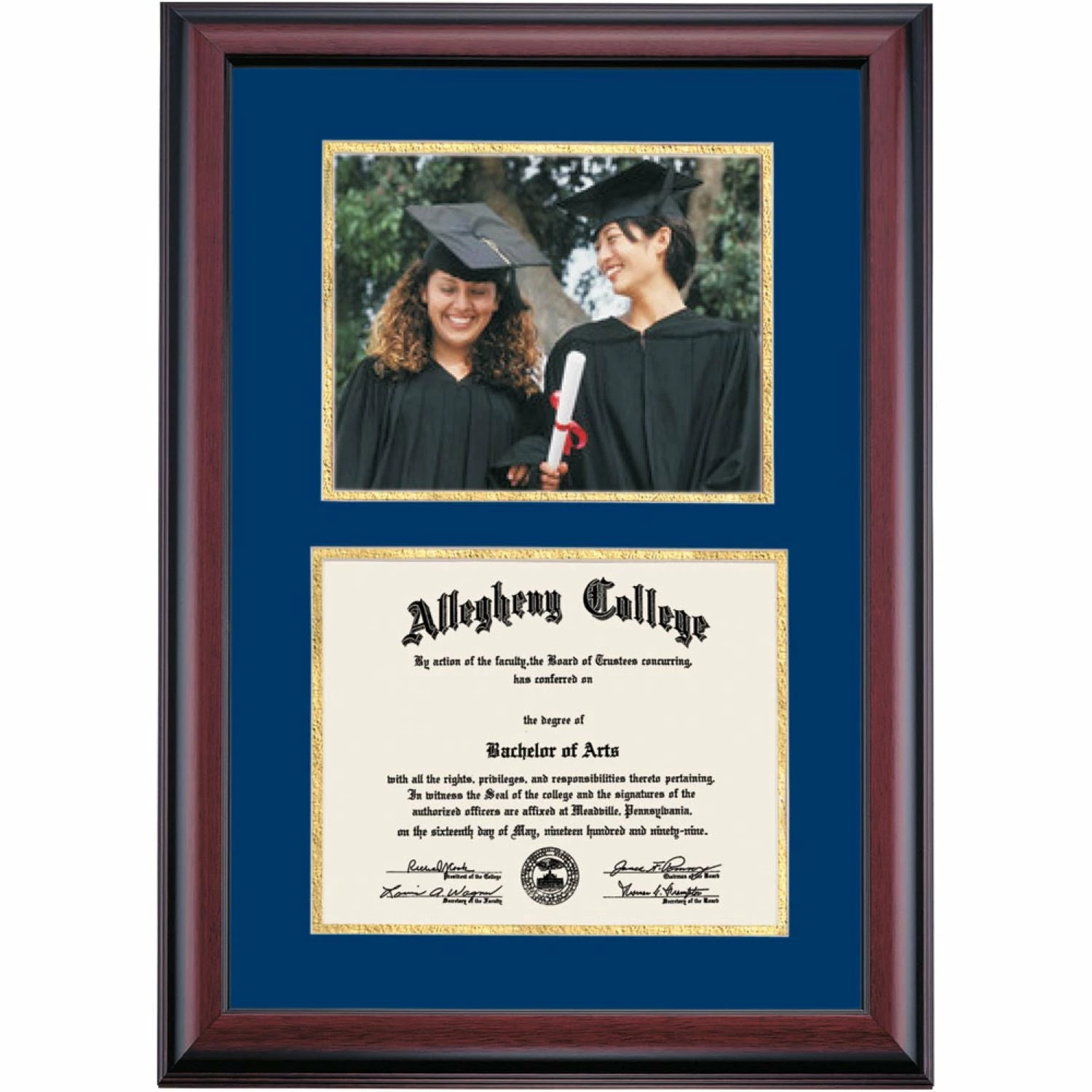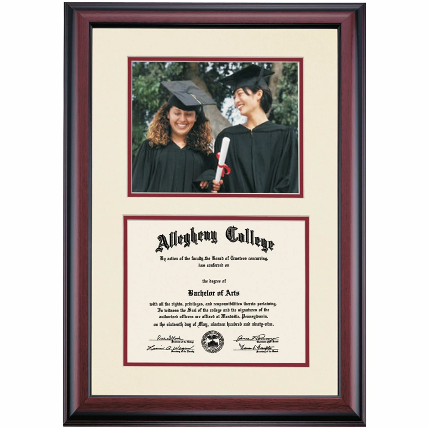 Celebrate your graduation in style with this handcrafted premier diploma frame which includes an opening for an 8×10 photograph (horizontal). Custom crafted to fit your Allegheny College diploma, this frame features accent matting and high quality hardwood moulding.