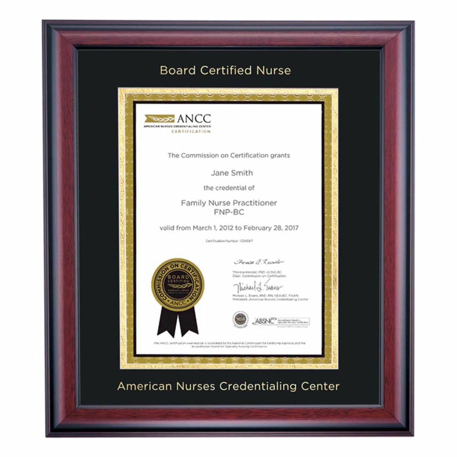 Celebrate your graduation in style with this handcrafted diploma frame. Custom crafted to fit your American Nurses Credentialing Center Certificate, this frame is embossed in gold leaf and features Black/Gold accent matting and high quality hardwood moulding.