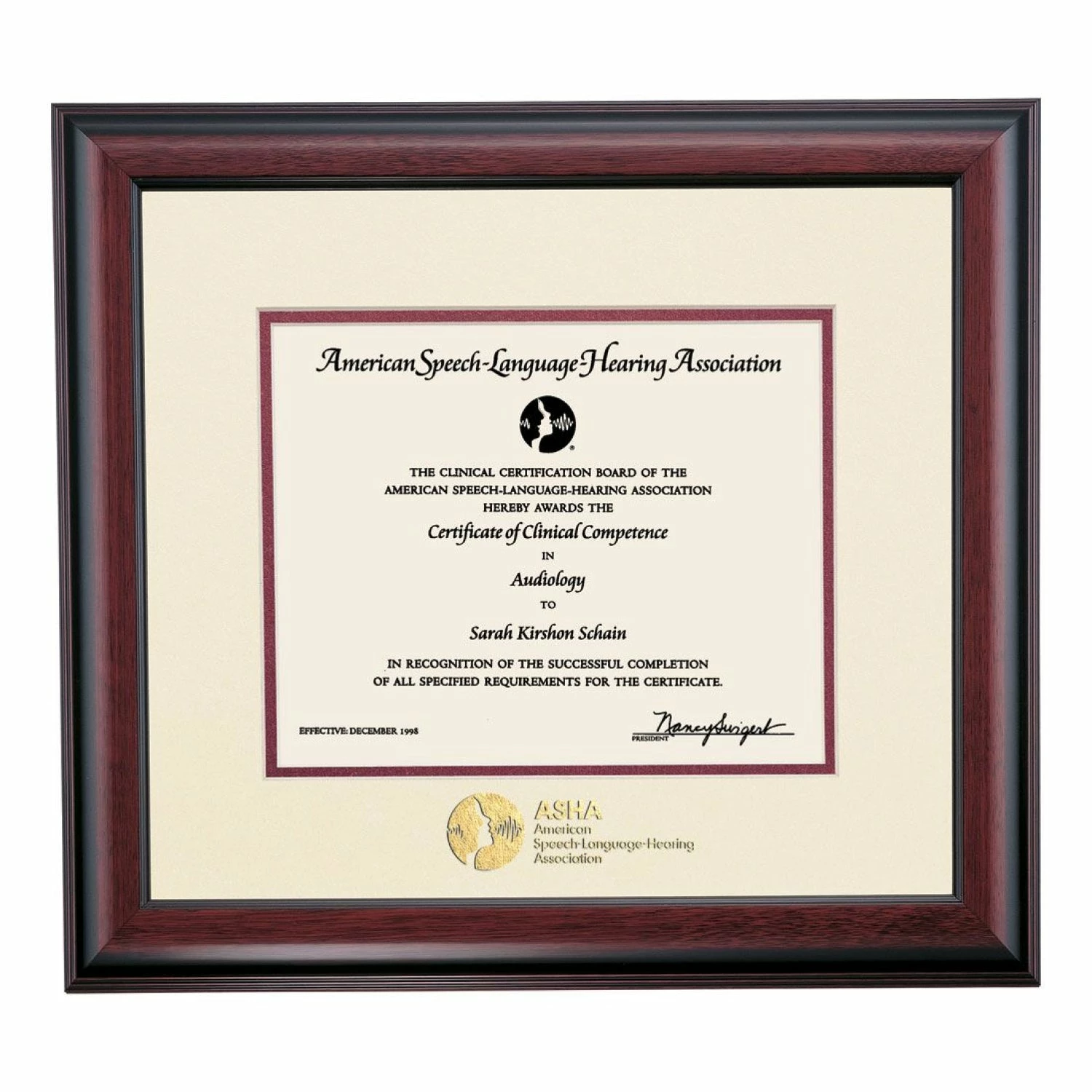 Celebrate your graduation in style with this handcrafted certificate frame. Custom crafted to fit your American Speech-Language-Hearing Association Certificate, this frame is embossed in gold leaf with your school name and seal and features Maroon accent matting and high quality hardwood moulding.