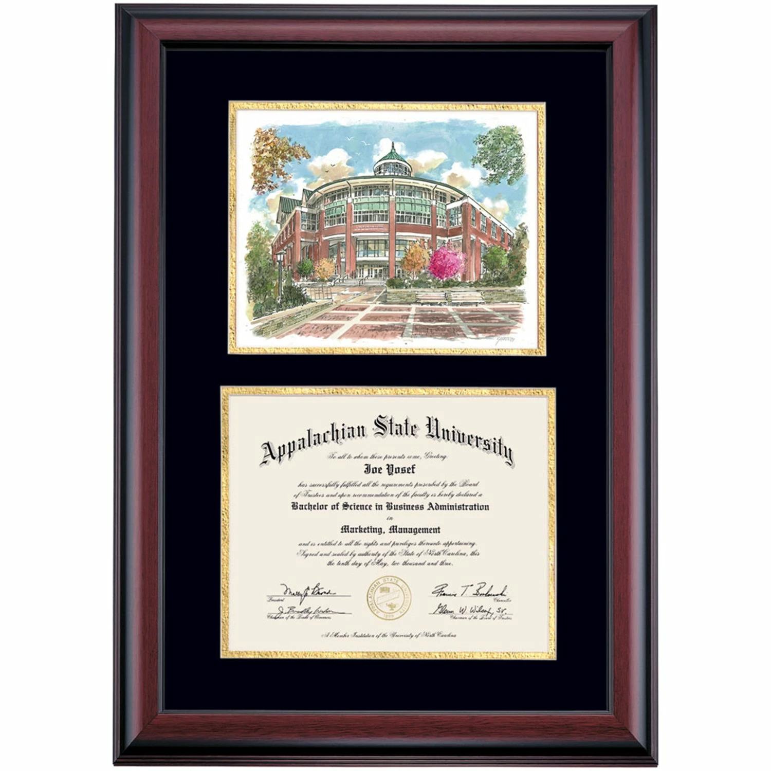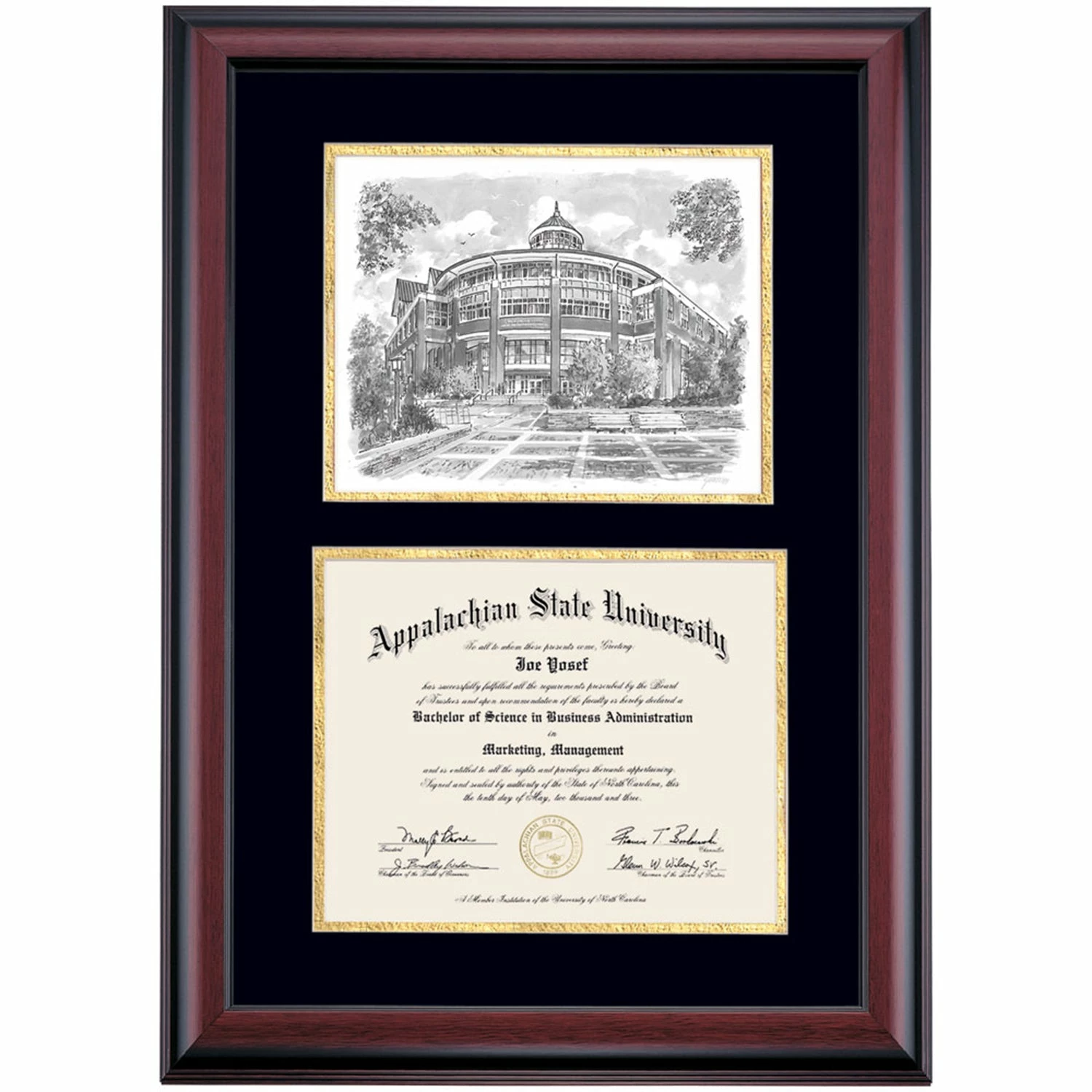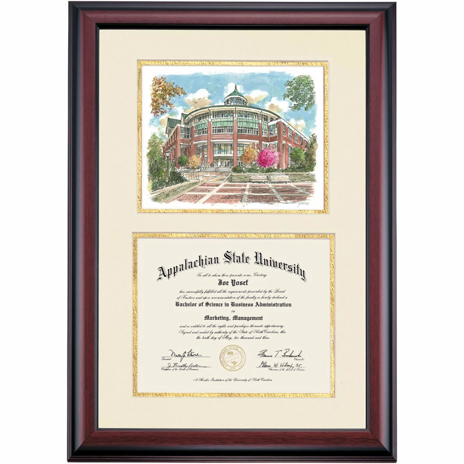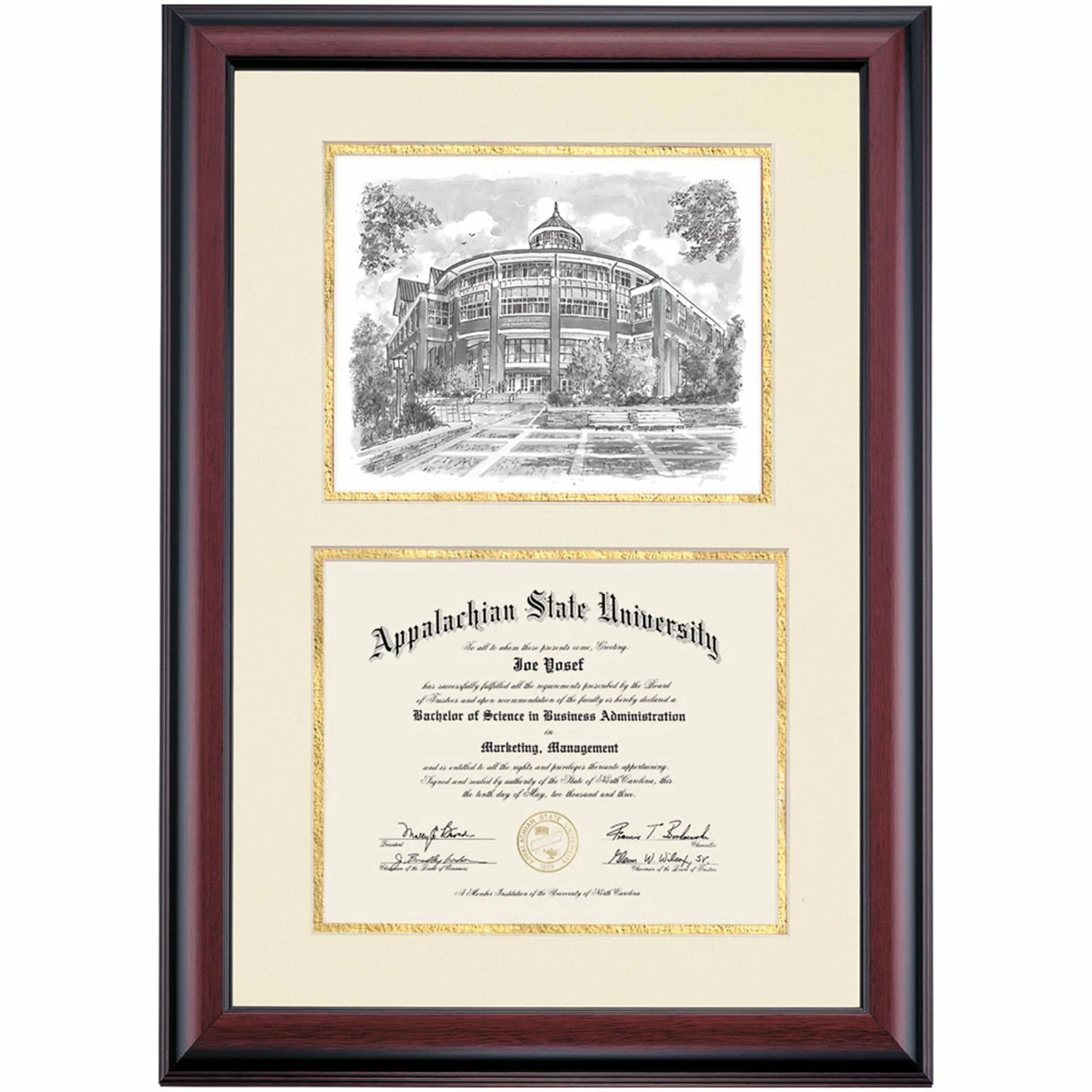 Celebrate your graduation in style with this handcrafted premier diploma frame which includes a Professional Print of Belk Library. Custom crafted to fit your Appalachian State University diploma, this frame features accent matting and high quality hardwood moulding.