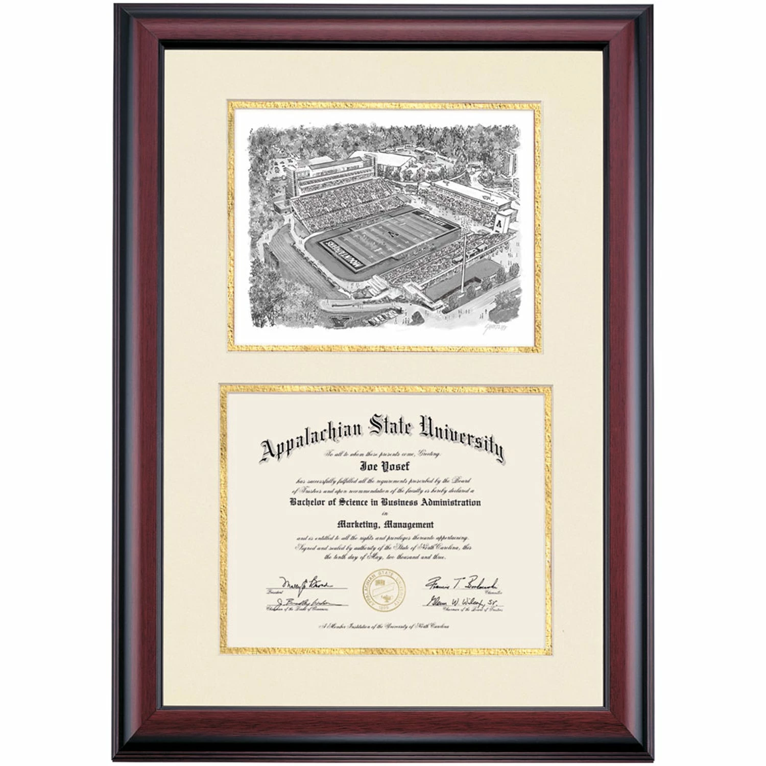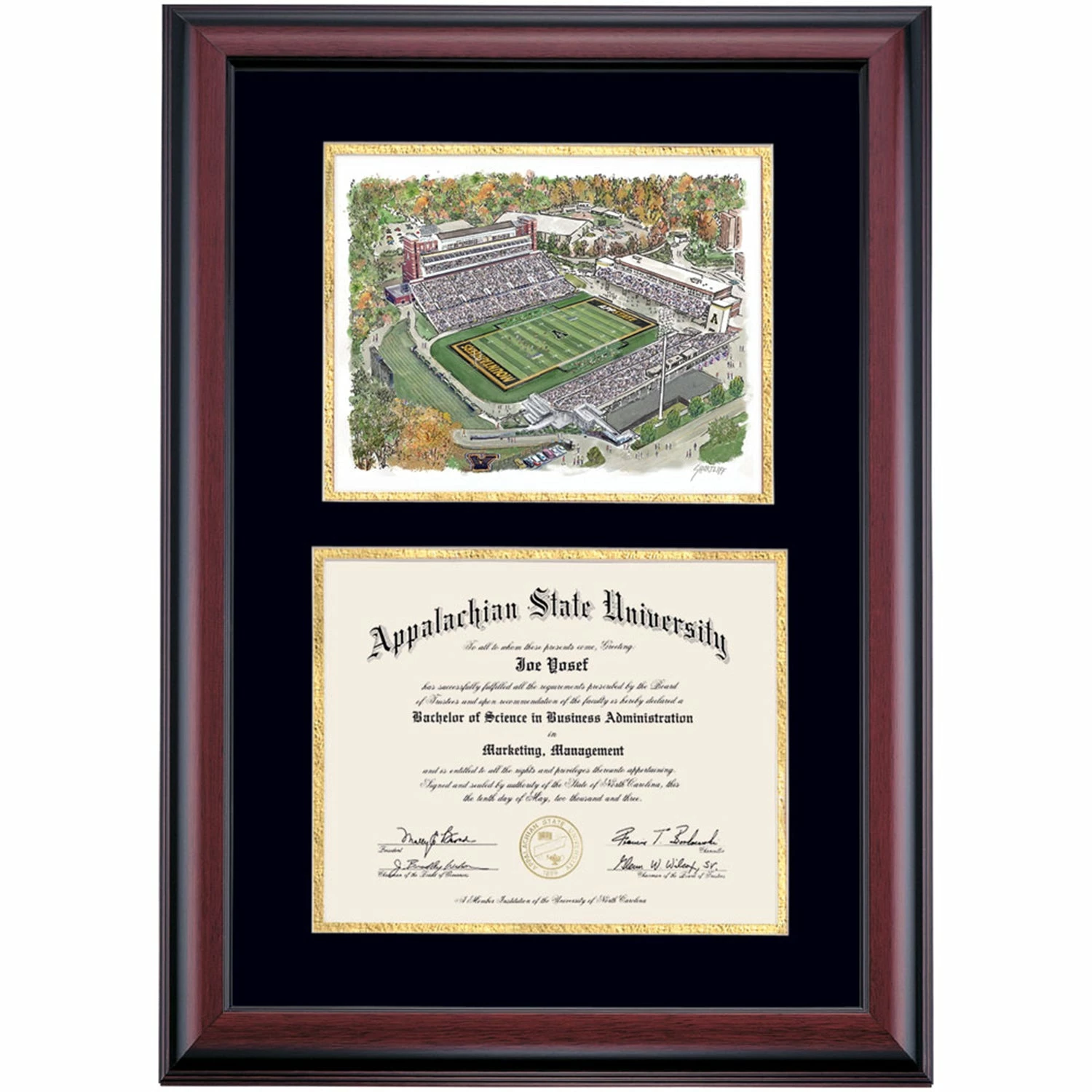 Celebrate your graduation in style with this handcrafted premier diploma frame which includes a Professional Print of the Football Stadium. Custom crafted to fit your Appalachian State University diploma, this frame features accent matting and high quality hardwood moulding.