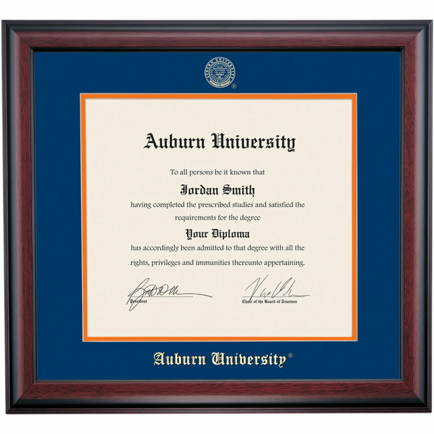 Celebrate your graduation in style with this handcrafted diploma frame. Custom crafted to fit your Auburn University diploma, this frame is embossed with your school name and seal and features Navy/Orange accent matting and high quality hardwood moulding.