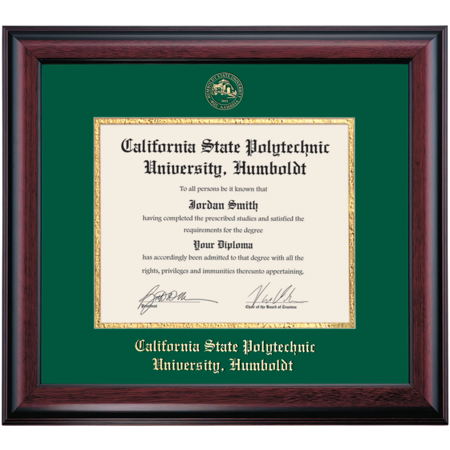 Celebrate your graduation in style with this handcrafted diploma frame. Custom crafted to fit your California State Polytechnic, Humboldt diploma, this frame is embossed with your school name and seal and features Hunter/Gold accent matting and high quality hardwood moulding.