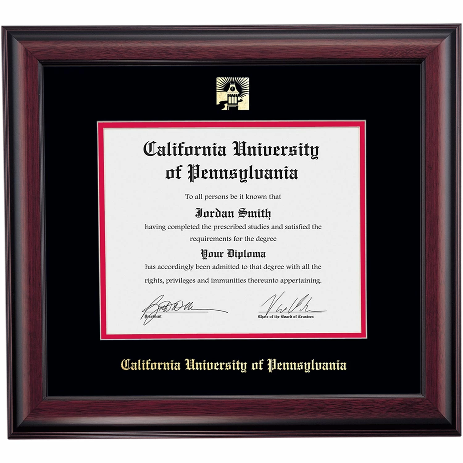 Celebrate your graduation in style with this handcrafted diploma frame. Custom crafted to fit your California University of Pennsylvania diploma, this frame is embossed with your school name and seal and features Black/Cherry accent matting and high quality hardwood moulding.