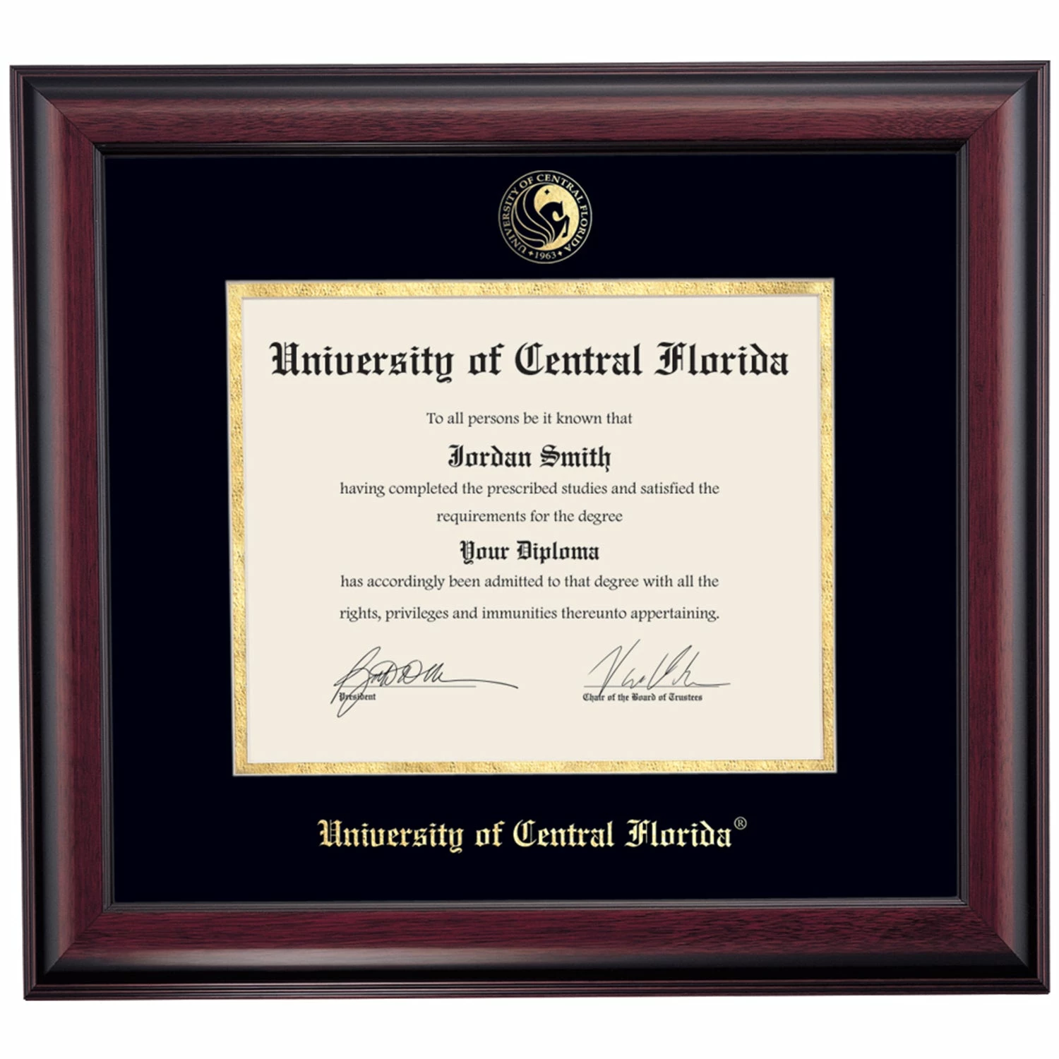 Celebrate your graduation in style with this handcrafted diploma frame. Custom crafted to fit your University of Central Florida diploma, this frame is embossed with your school name and seal and features Black/Gold accent matting and high quality hardwood moulding.