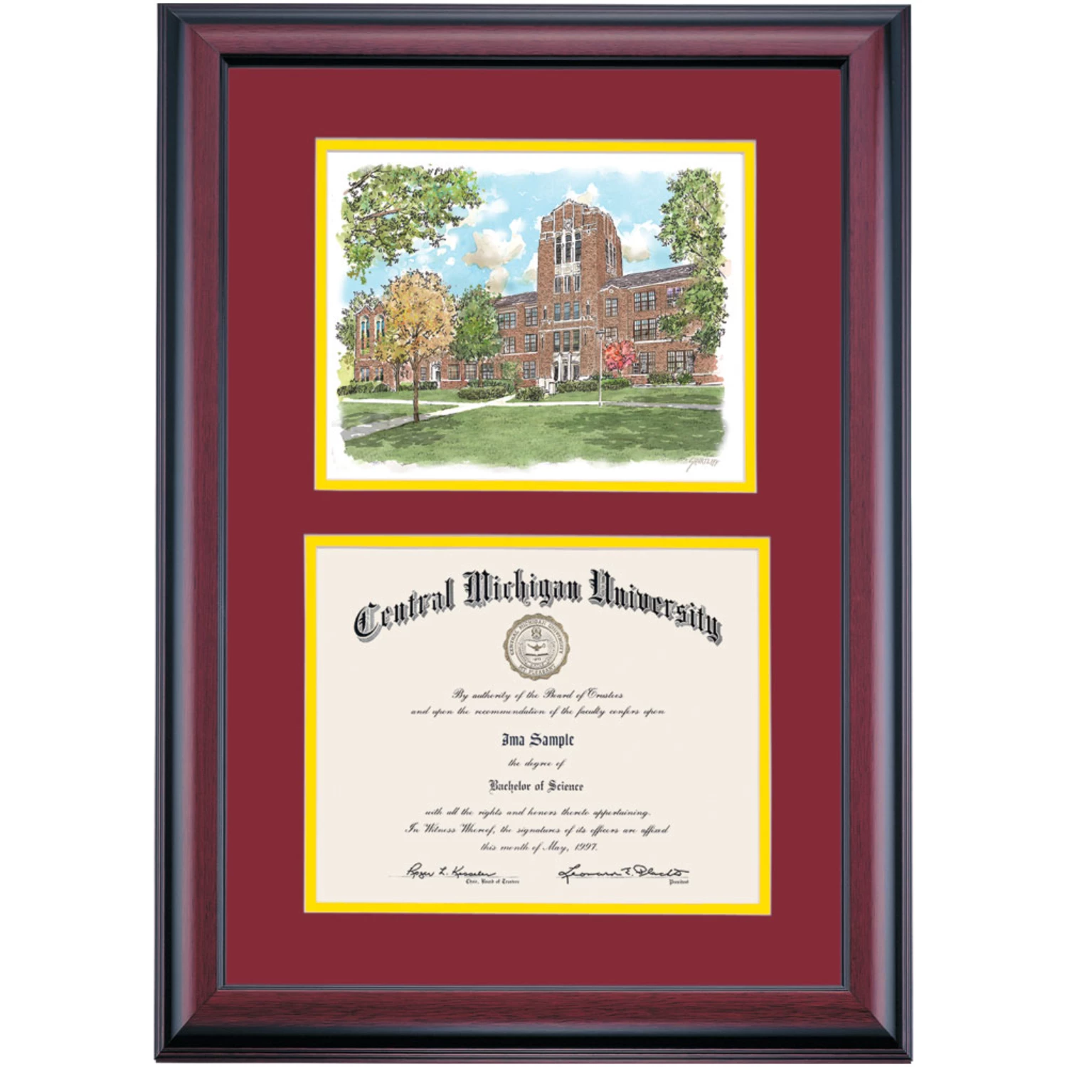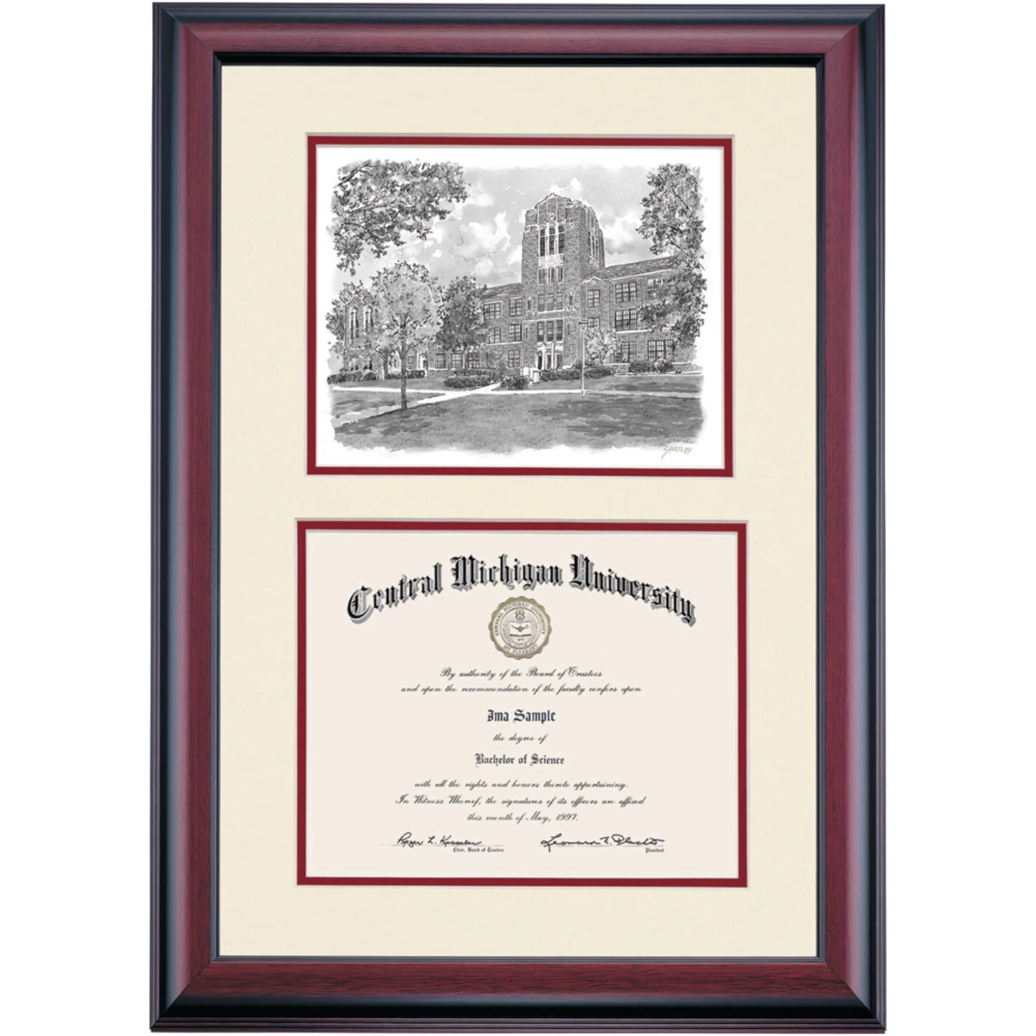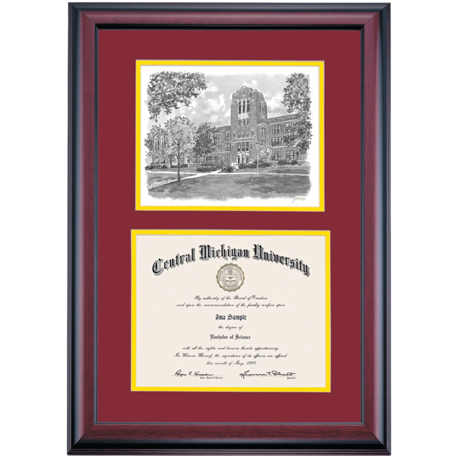 Celebrate your graduation in style with this handcrafted premier diploma frame which includes a Professional Print of Warriner Hall. Custom crafted to fit your Central Michigan University diploma, this frame features accent matting and high quality hardwood moulding.