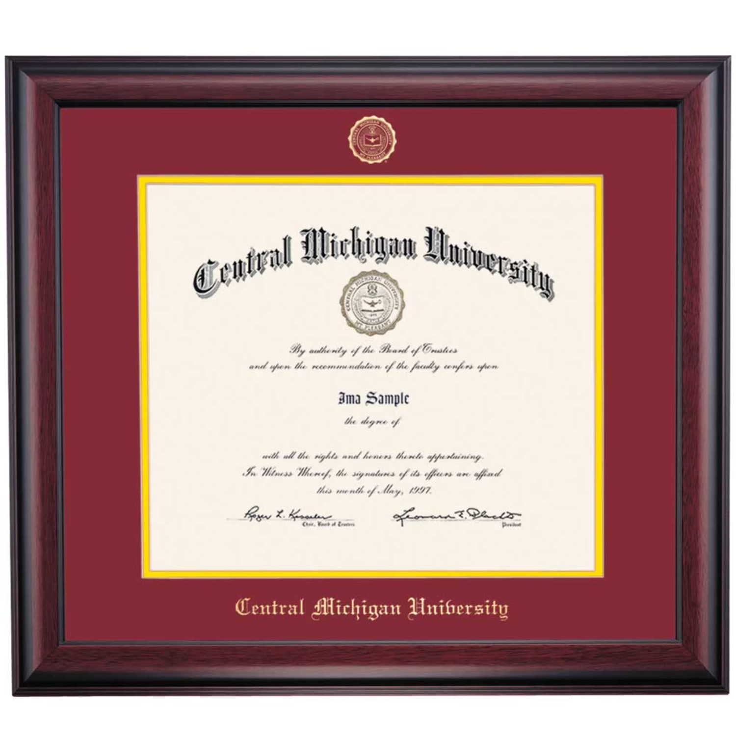 Celebrate your graduation in style with this handcrafted diploma frame. Custom crafted to fit your Central Michigan University Ph.D. diploma, this frame is embossed with your school name and seal and features Maroon/Yellow accent matting and high quality hardwood moulding.