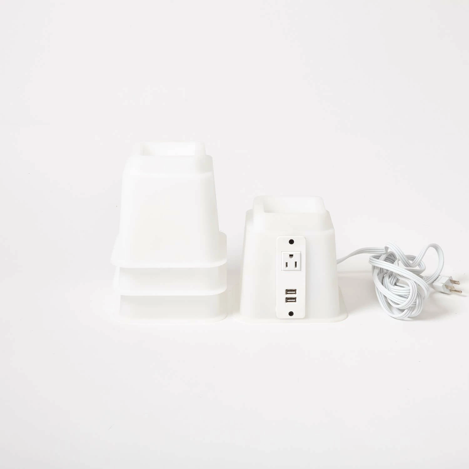 Provides a convenient outlet right next to your bed. Cover these with a Dormify bedskirt to keep all of your cords hidden away. Can support up to 300 lbs per riser. Made from plastic. Comes in a set of 4. Cord is 5ft long.