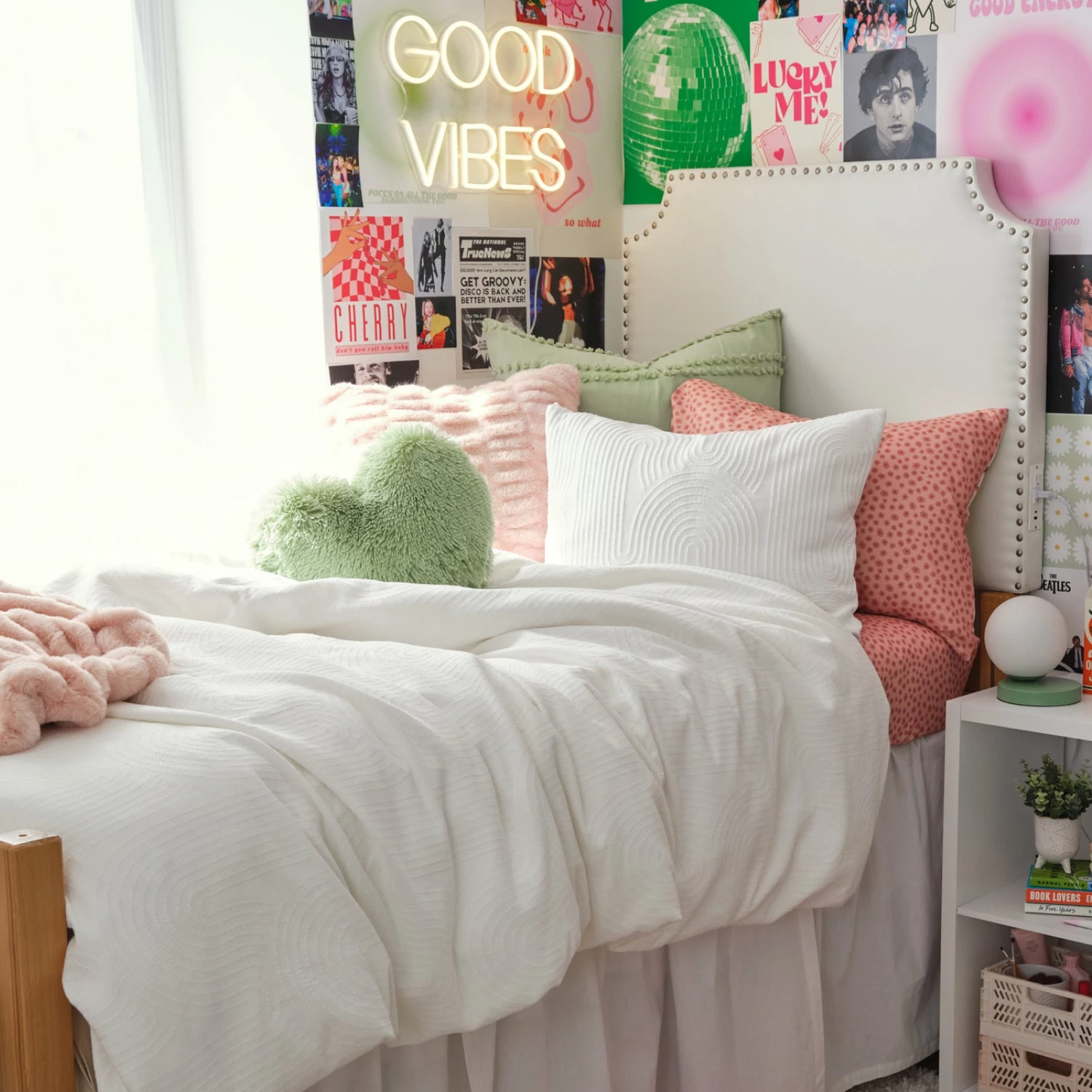 This boho vibe and easy to machine wash duvet cover and sham set is an effortless way to add texture to your bed. The top is made from 100% cotton and has arch detailing. The under side is 100% poly. Comes with 1 duvet cover and 1 standard sham set. Duvet insert sold separately.
