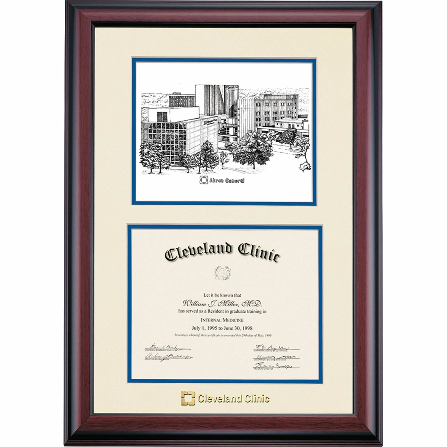 Celebrate your graduation in style with this handcrafted premier certificate frame, embossed with the school name and seal, which includes a Professional Pen & Ink Print of Cleveland Clinic Akron. Custom crafted to fit your Cleveland Clinic certificate, this frame features Ivory/Royal accent matting and high quality hardwood moulding.