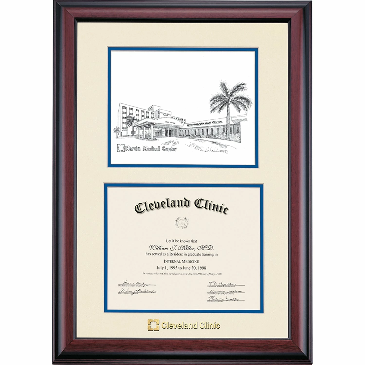 Celebrate your graduation in style with this handcrafted premier certificate frame, embossed with the school name and seal, which includes a Professional Pen & Ink Print of Cleveland Clinic Martin Health. Custom crafted to fit your Cleveland Clinic certificate, this frame features Ivory/Royal accent matting and high quality hardwood moulding.