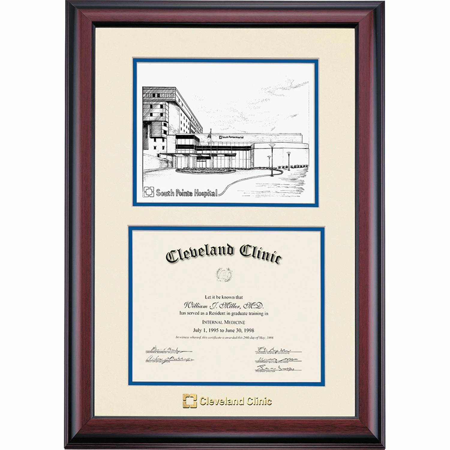 Celebrate your graduation in style with this handcrafted premier certificate frame, embossed with the school name and seal, which includes a Professional Pen & Ink Print of Cleveland Clinic South Pointe. Custom crafted to fit your Cleveland Clinic certificate, this frame features Ivory/Royal accent matting and high quality hardwood moulding.