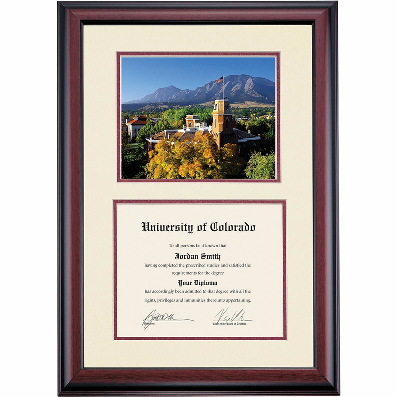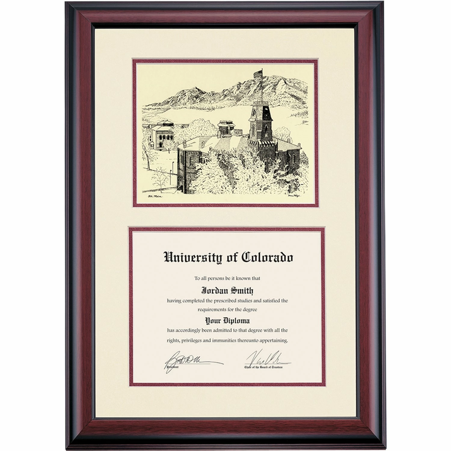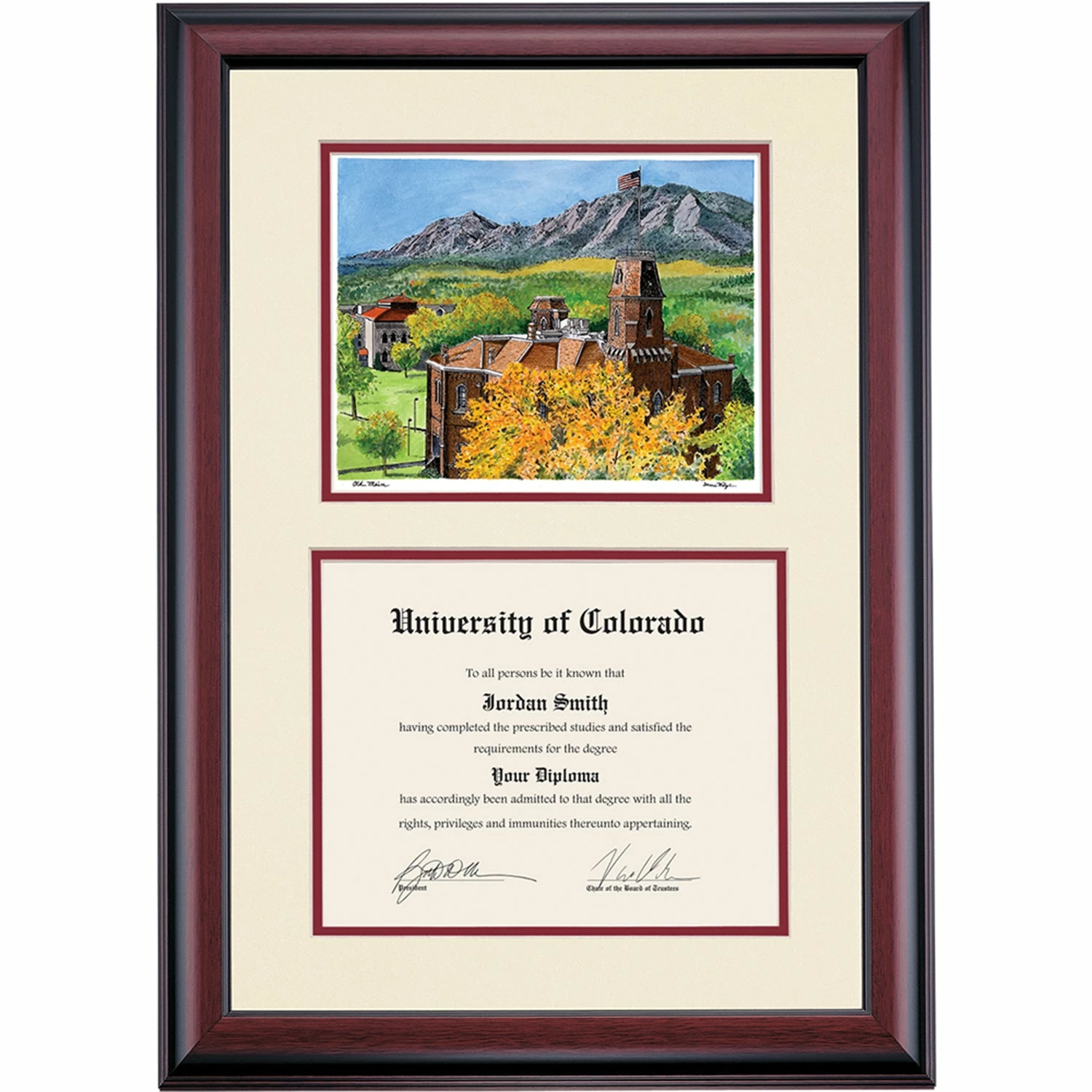 Celebrate your graduation in style with this handcrafted premier diploma frame which includes a Professional Print of Old Main. Custom crafted to fit your University of Colorado diploma, this frame features accent matting and high quality hardwood moulding.