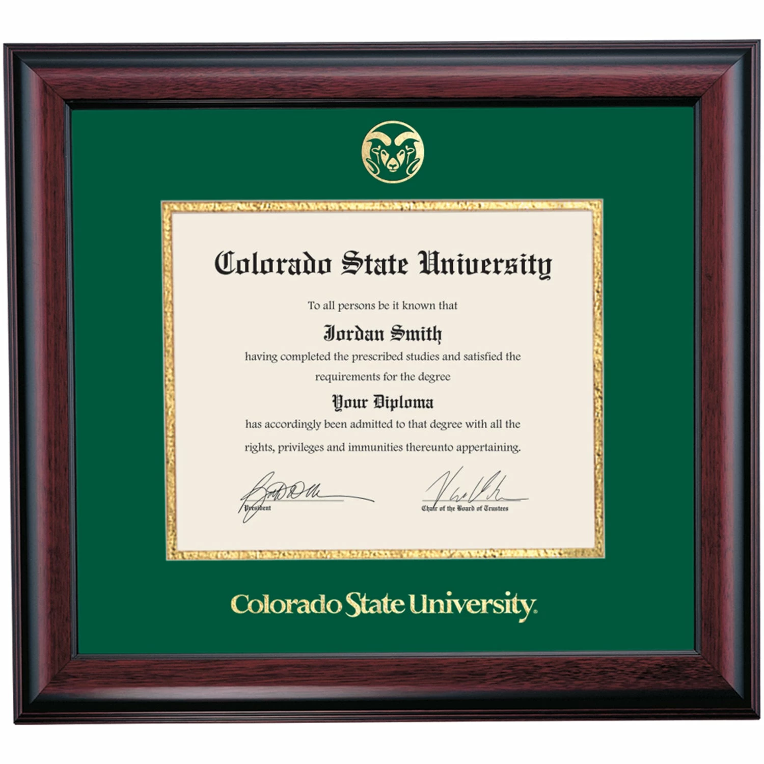Celebrate your graduation in style with this handcrafted diploma frame. Custom crafted to fit your Colorado State University diploma, this frame is embossed with your school name and the Ram seal and features Hunter/Gold accent matting and high quality hardwood moulding.