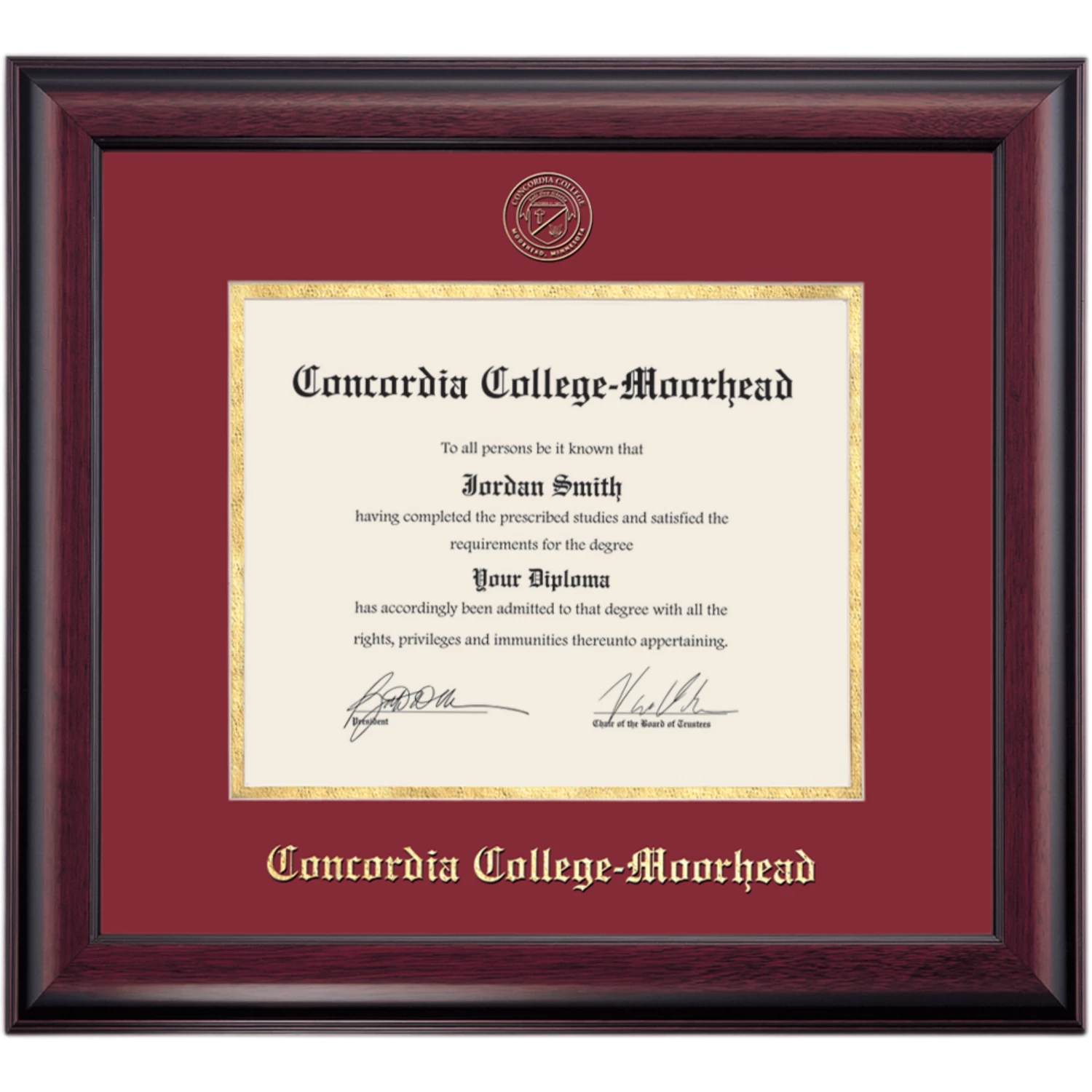 Celebrate your graduation in style with this handcrafted diploma frame. Custom crafted to fit your Concordia College Moorhead diploma, this frame is embossed with your school name and seal and features Maroon/Gold accent matting and high quality hardwood moulding.