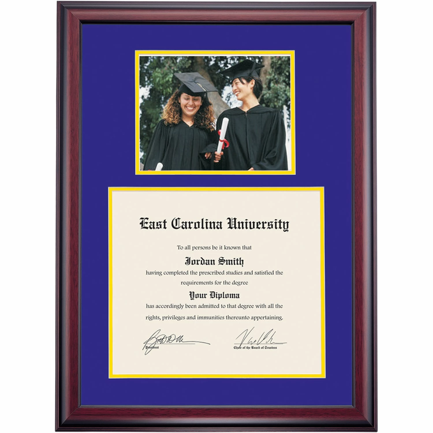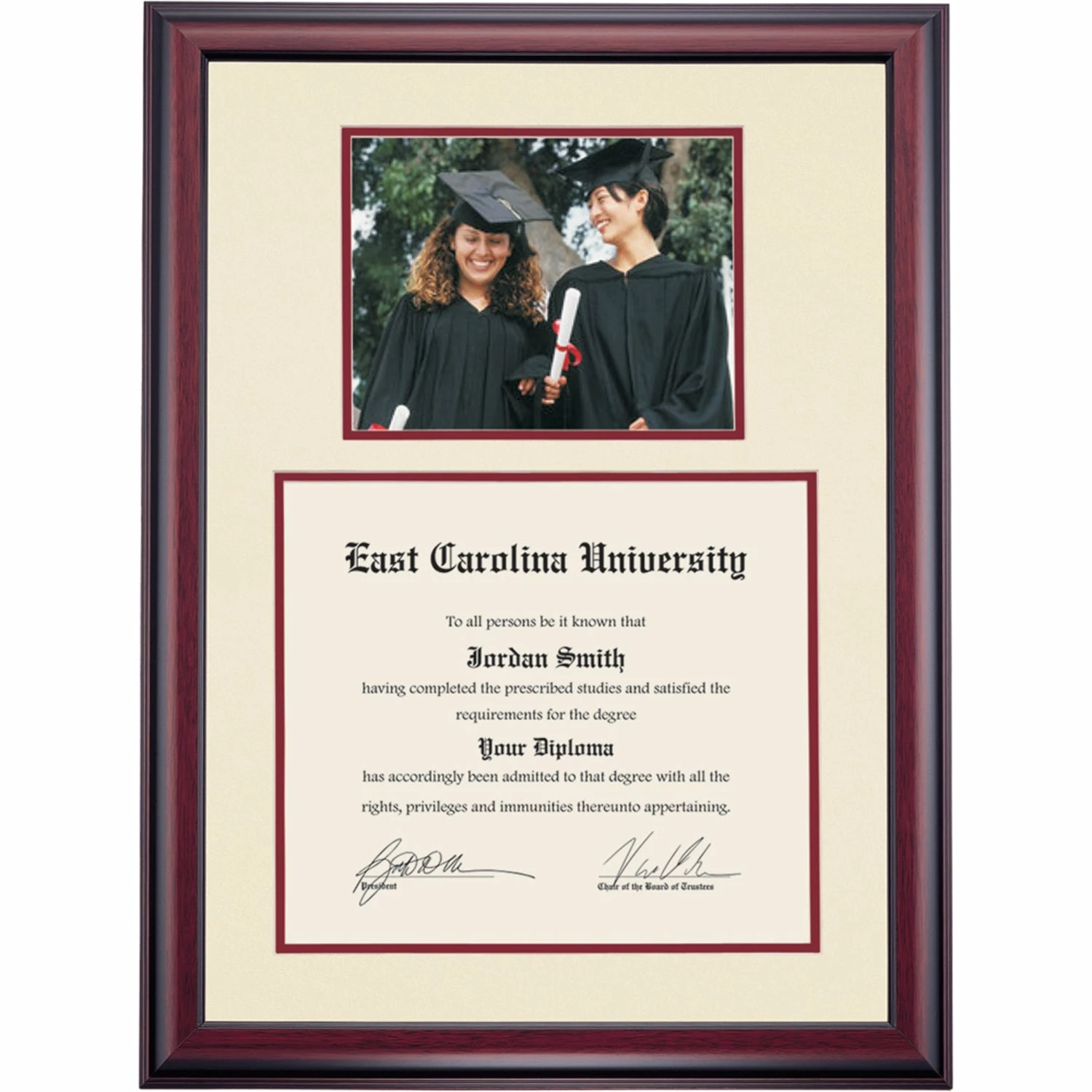 Celebrate your graduation in style with this handcrafted premier diploma frame which includes an opening for an 8×10 photograph (horizontal). Custom crafted to fit your East Carolina University diploma, this frame features accent matting and high quality hardwood moulding.