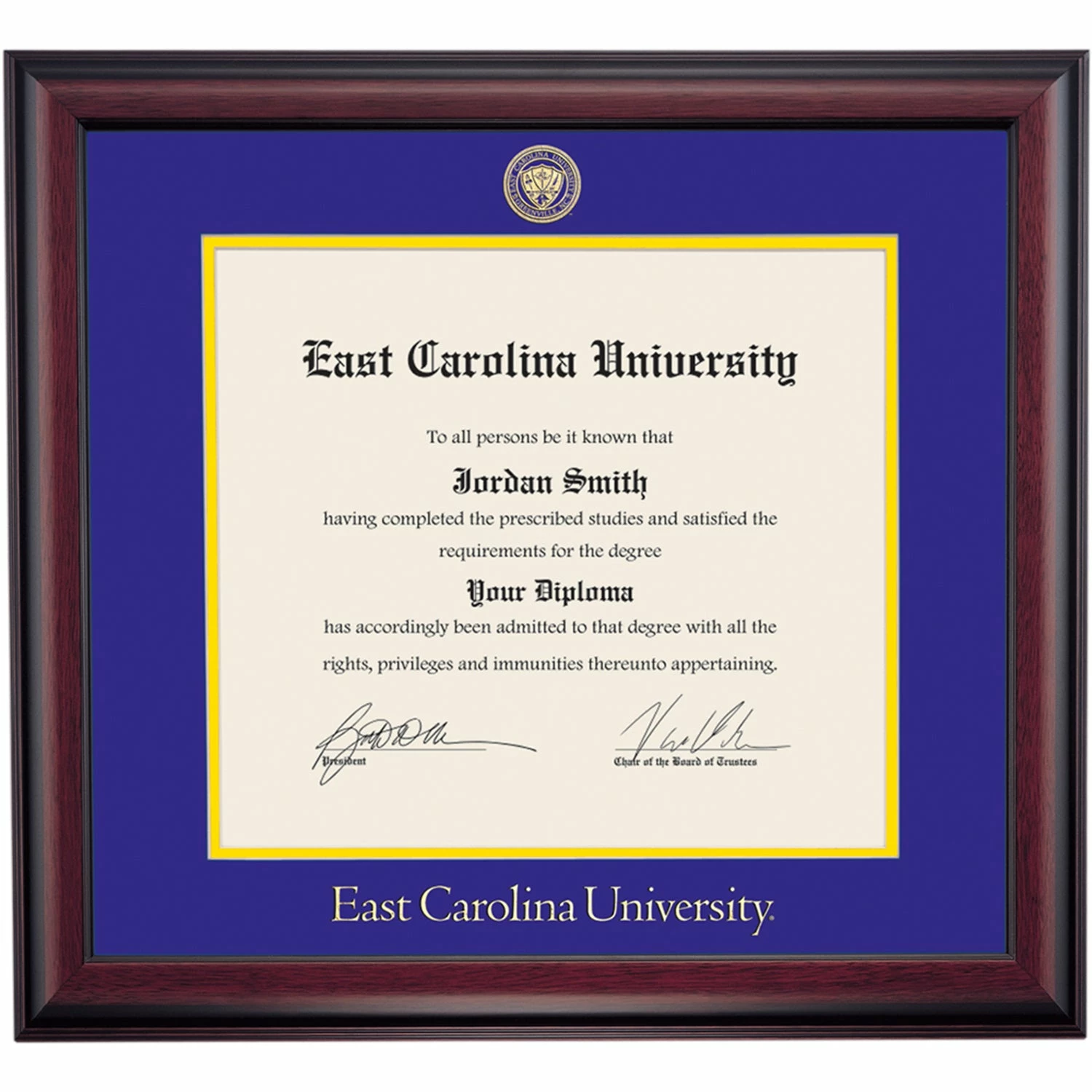 Celebrate your graduation in style with this handcrafted diploma frame. Custom crafted to fit your East Carolina University diploma, this frame is embossed with your school name and seal and features Purple/Yellow accent matting and high quality hardwood moulding.