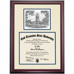 Celebrate your graduation in style with this handcrafted premier diploma frame which includes a Professional Print of Alumni Plaza. Custom crafted to fit your East Tennessee State University diploma, this frame features accent matting and high quality hardwood moulding.