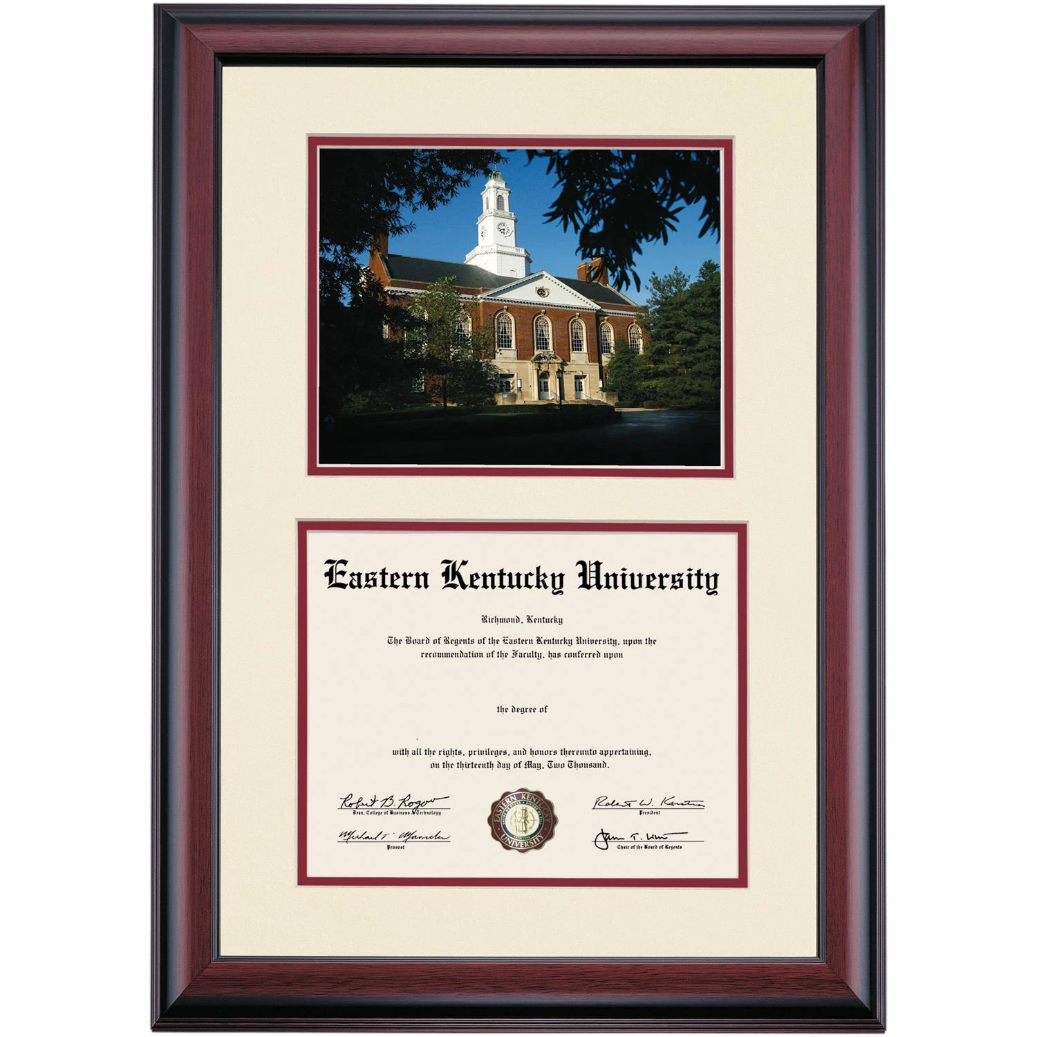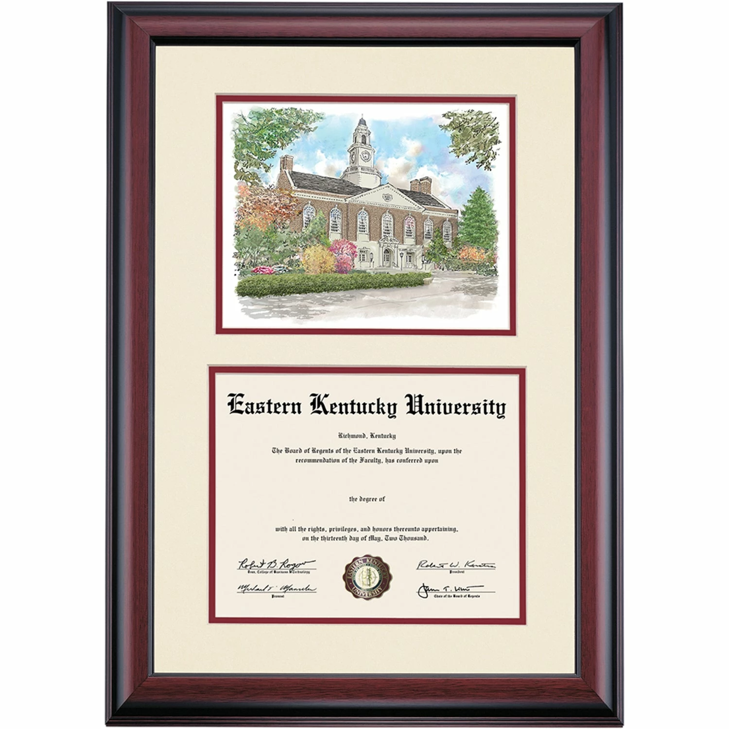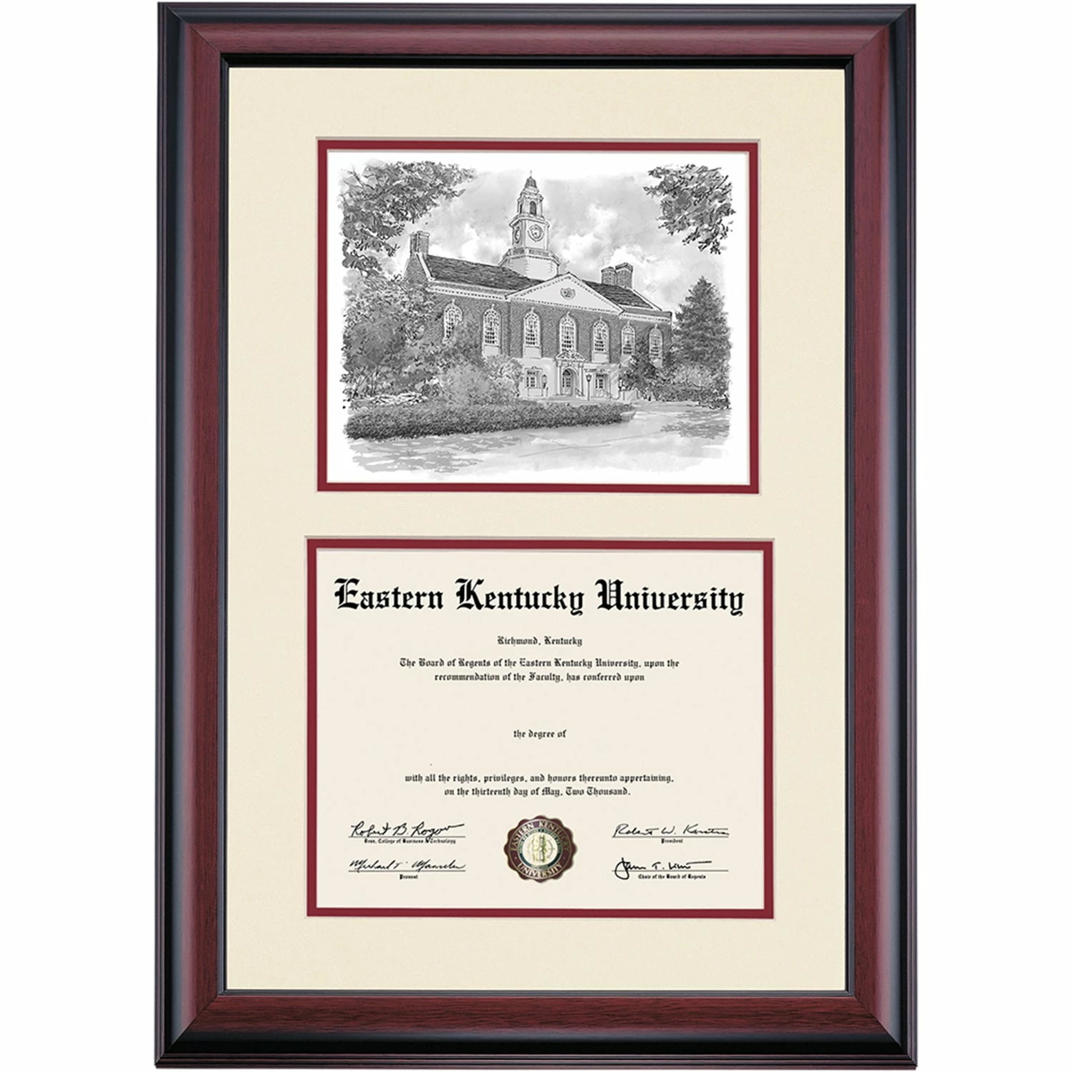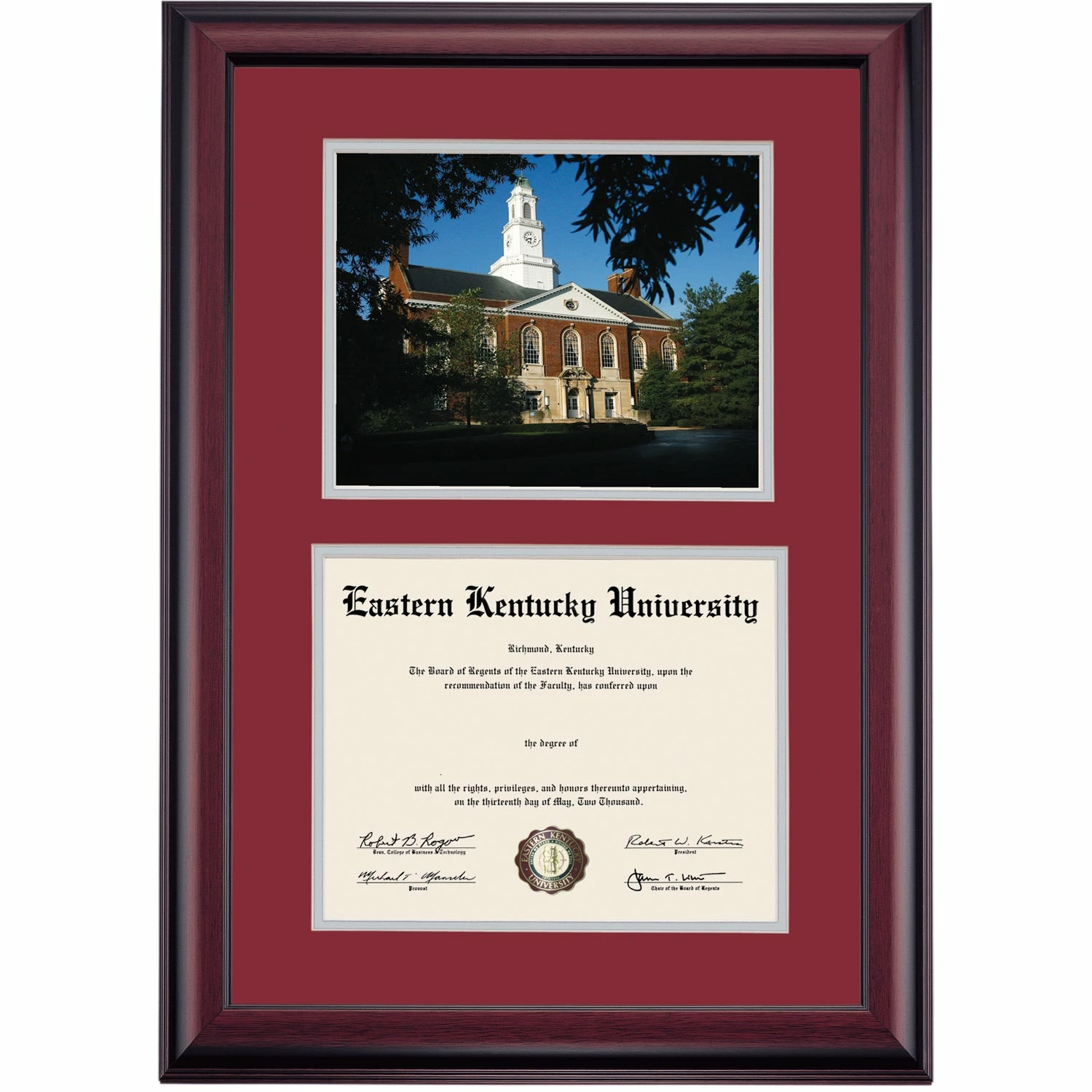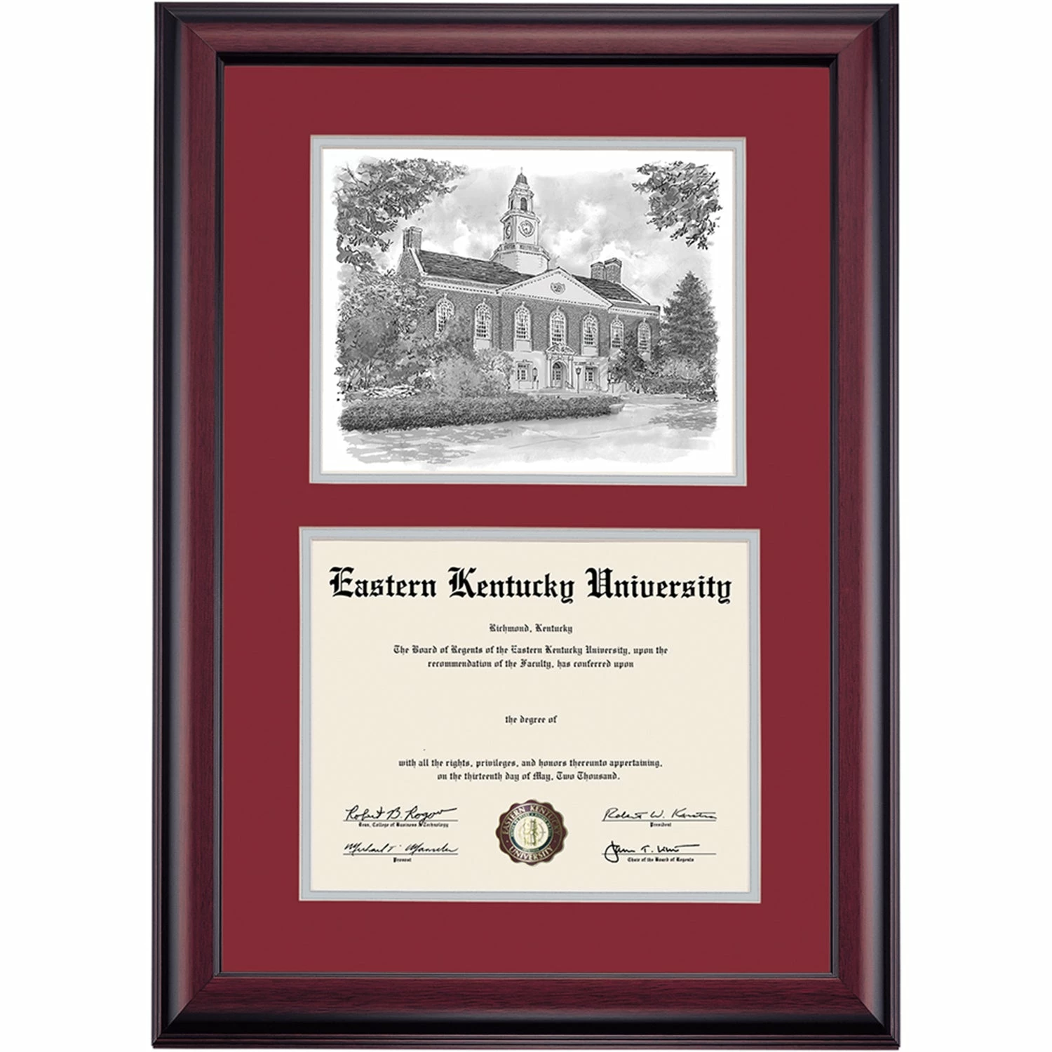 Celebrate your graduation in style with this handcrafted premier diploma frame which includes a Professional Print of Keen Johnson Building. Custom crafted to fit your Eastern Kentucky University diploma, this frame features accent matting and high quality hardwood moulding.