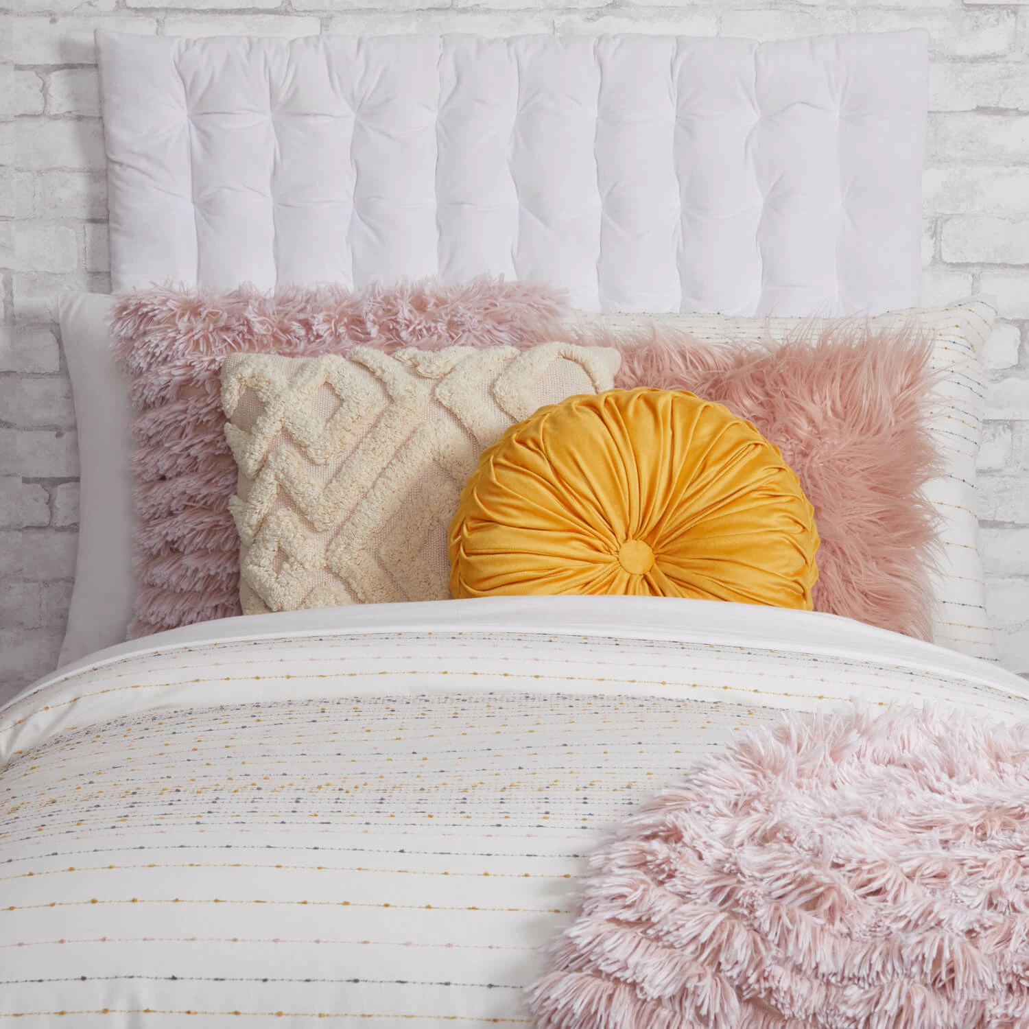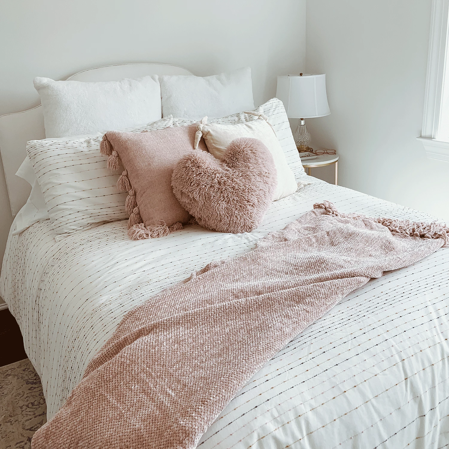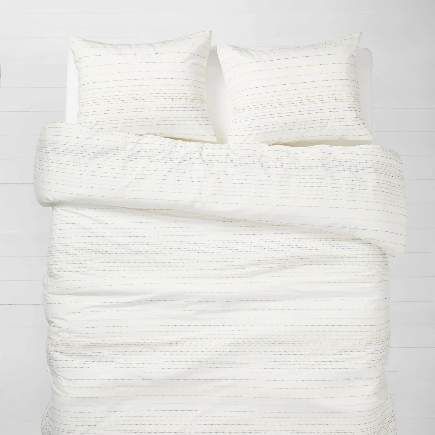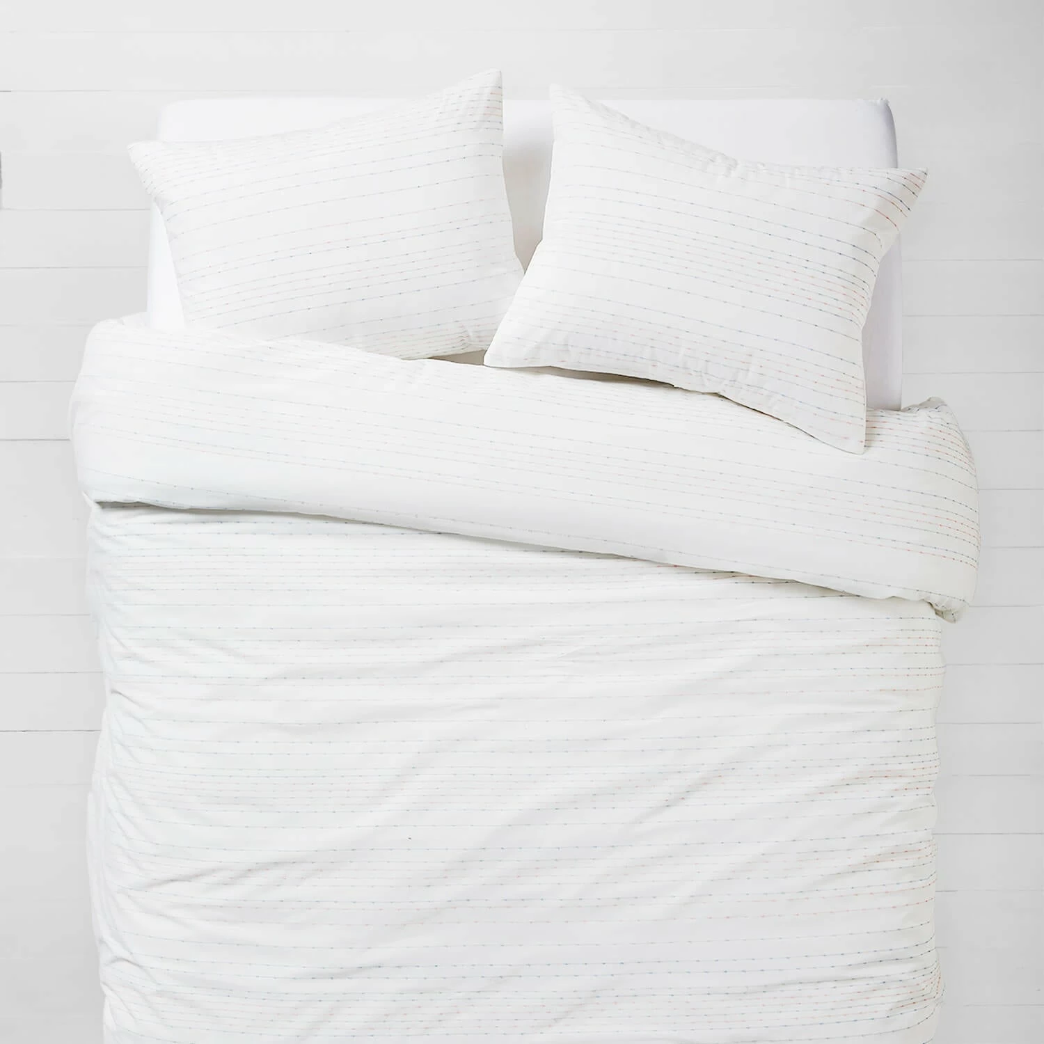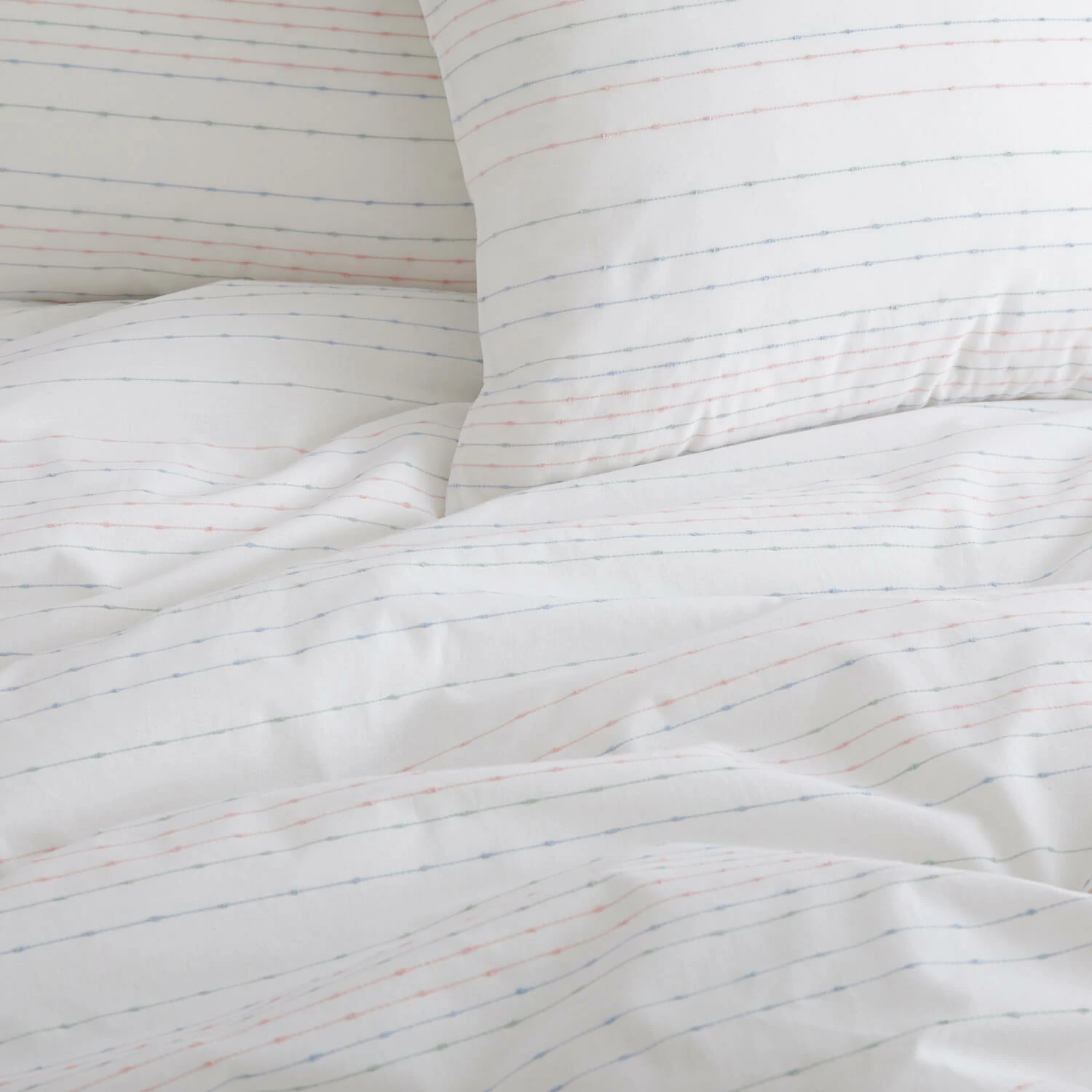 The Embroidered Stripe Comforter and Sham set draws the line and looks one of a kind. The Embroidered Stripe Comforter and Sham Set lets you play off the pastel tones for a bedroom that feels truly unique. Subtle hues, varying stripes, and a reverse of soft solid white make this multicolor bed so versatile that it can be styled in a million different ways.
