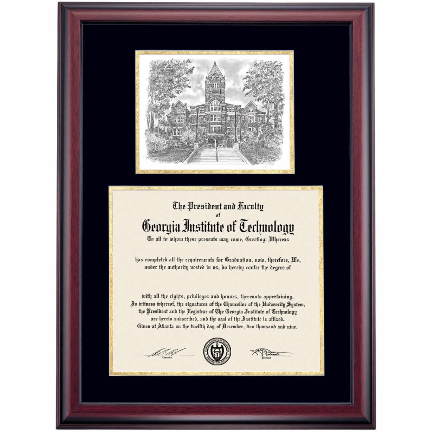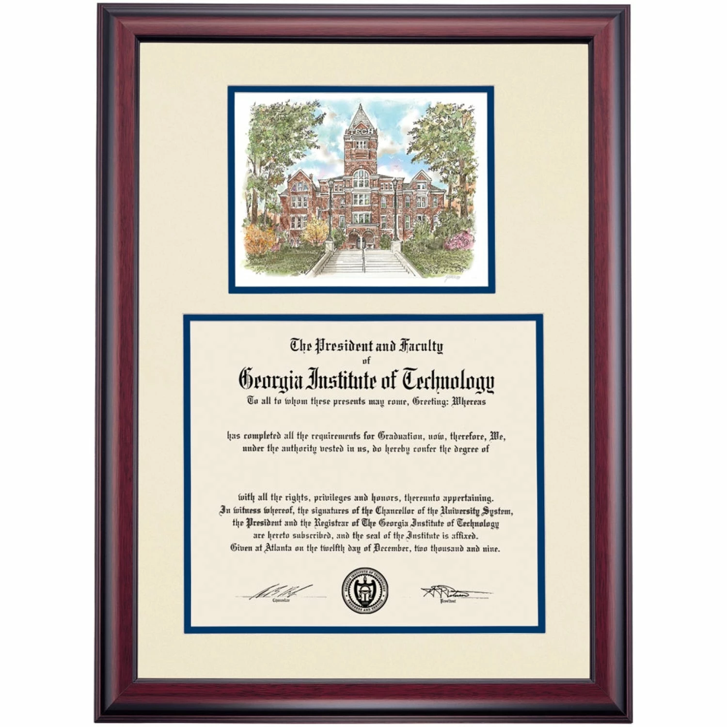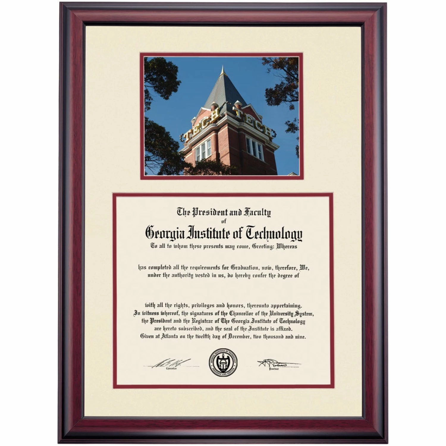 Celebrate your graduation in style with this handcrafted premier diploma frame which includes a Professional Print of Tech Tower. Custom crafted to fit your Georgia Institute of Technology diploma, this frame features accent matting and high quality hardwood moulding.