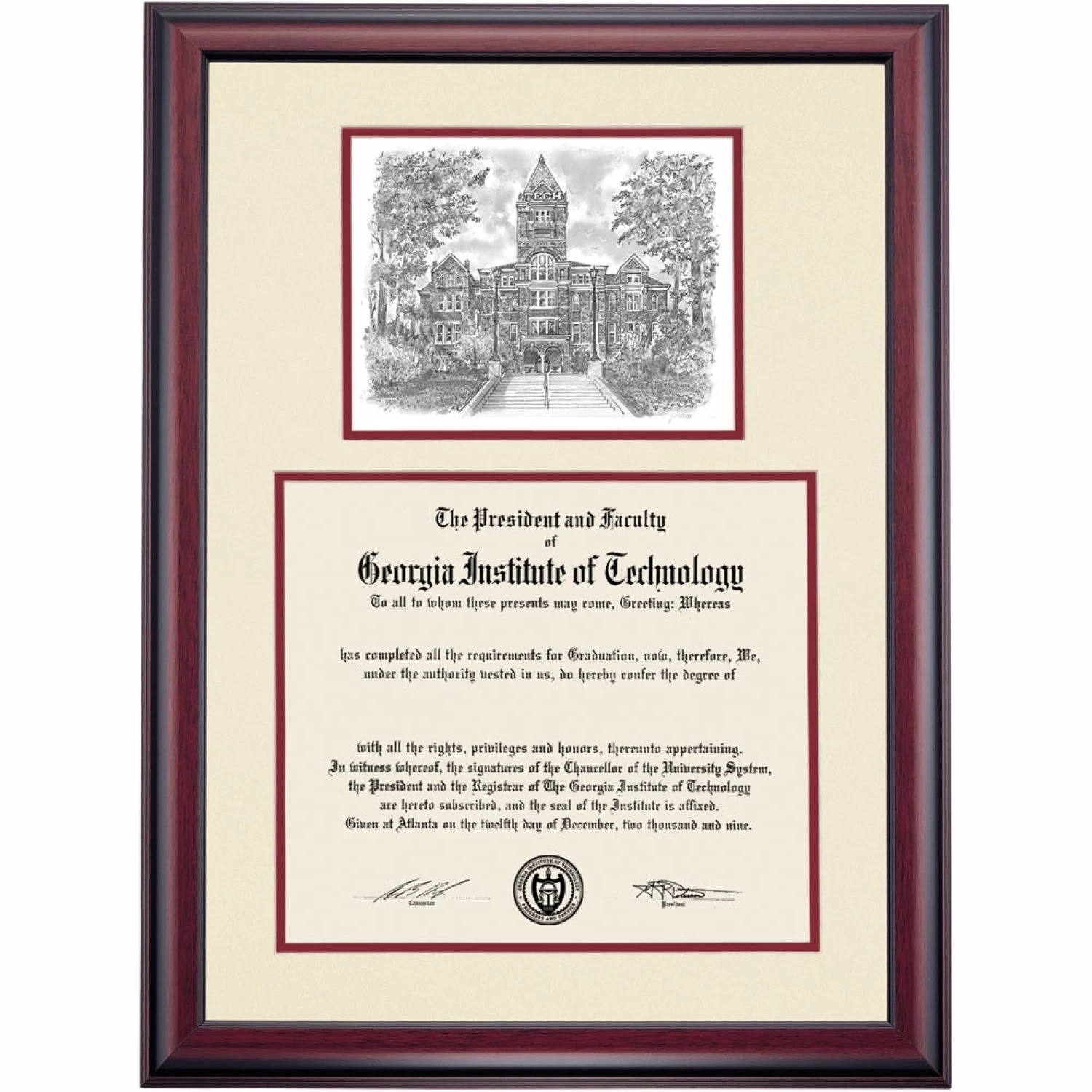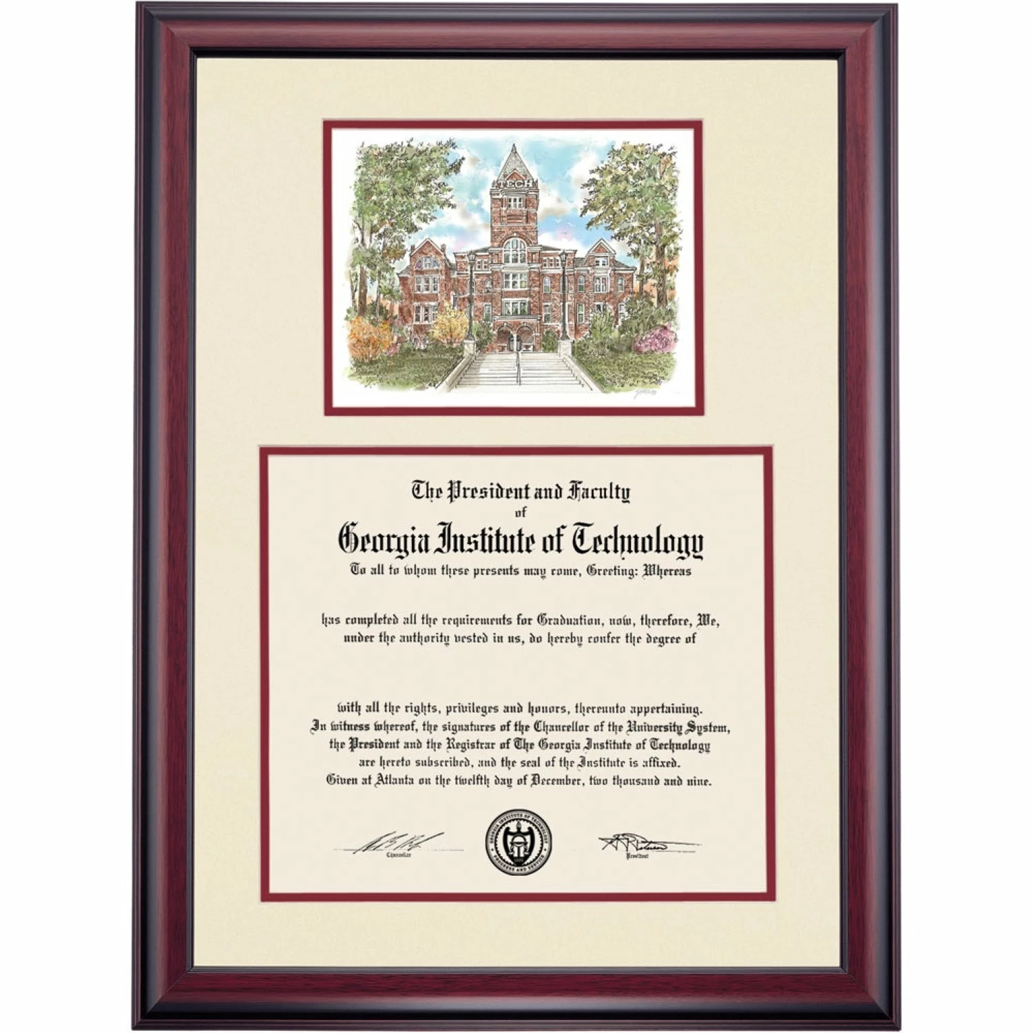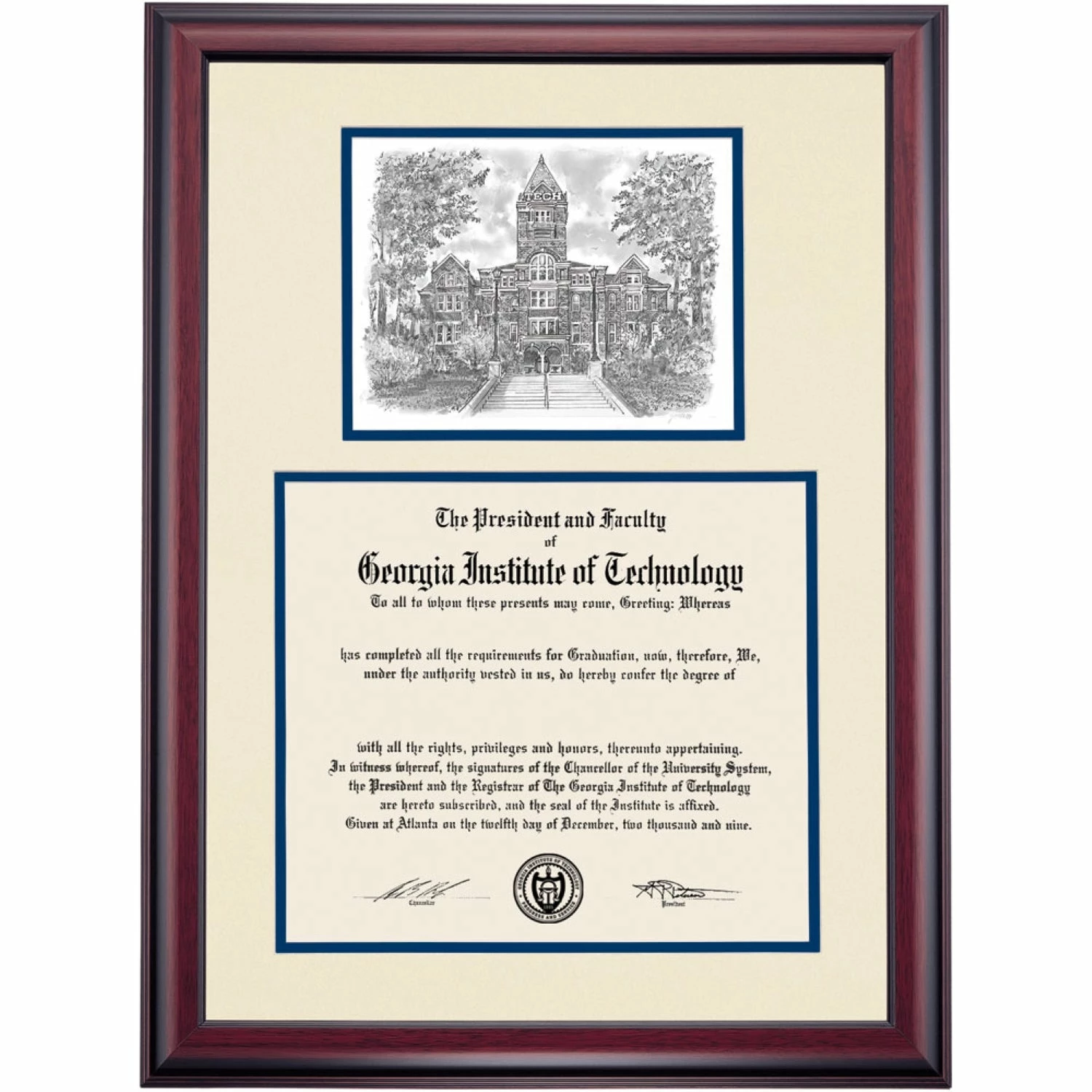 Celebrate your graduation in style with this handcrafted premier diploma frame which includes a Professional Print of Tech Tower. Custom crafted to fit your Georgia Institute of Technology diploma, this frame features accent matting and high quality hardwood moulding.