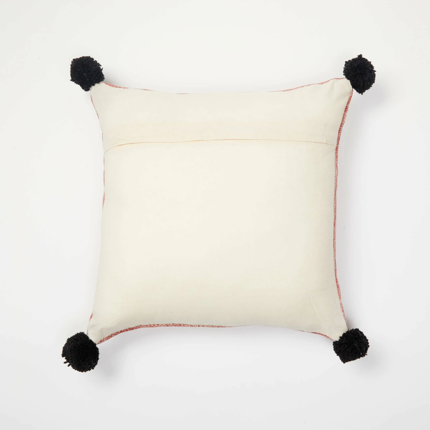 You’ll be helping support communities all over the world when you buy this pillow that’s made from recycled materials by artisans in India. The luxurious quality and fine details? Just the cherries on top. This square decorative throw pillow is reversible. It has black tassels on the end of each corner. One side of the pillow is red with a dotted square geometric lines, and the other side is a solid cream color. From sustainable home goods brand Imagine Home.