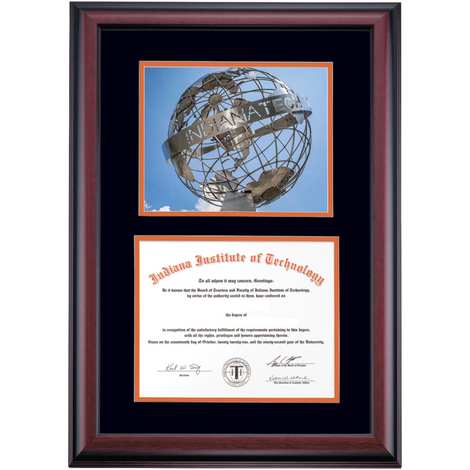 Celebrate your graduation in style with this handcrafted premier diploma frame which includes a Professional Photograph of the Globe. Custom crafted to fit your Indiana Tech diploma, this frame features accent matting and high quality hardwood moulding.