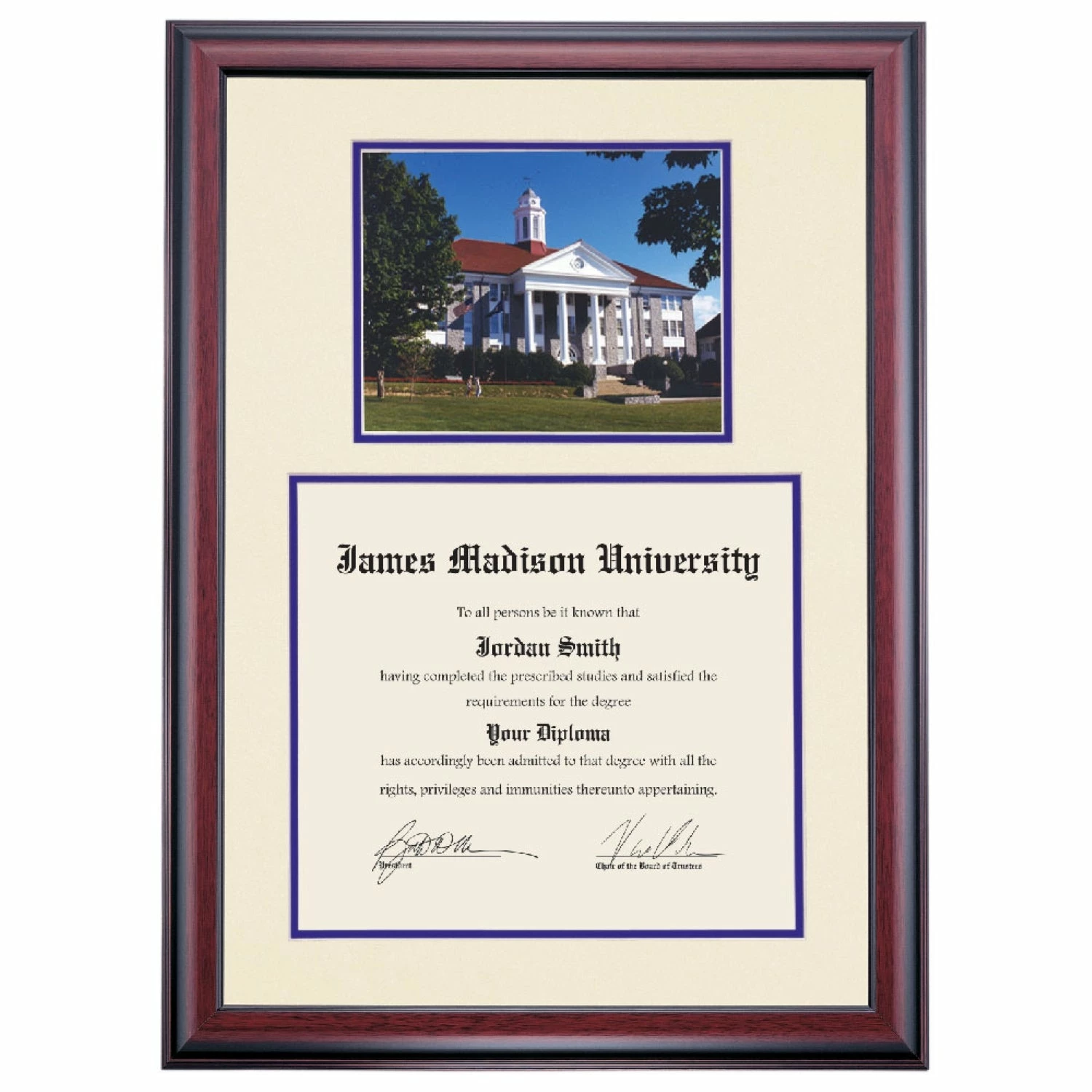 Celebrate your graduation in style with this handcrafted premier diploma frame which includes a Professional Print of Wilson Hall. Custom crafted to fit your James Madison University diploma, this frame features accent matting and high quality hardwood moulding.