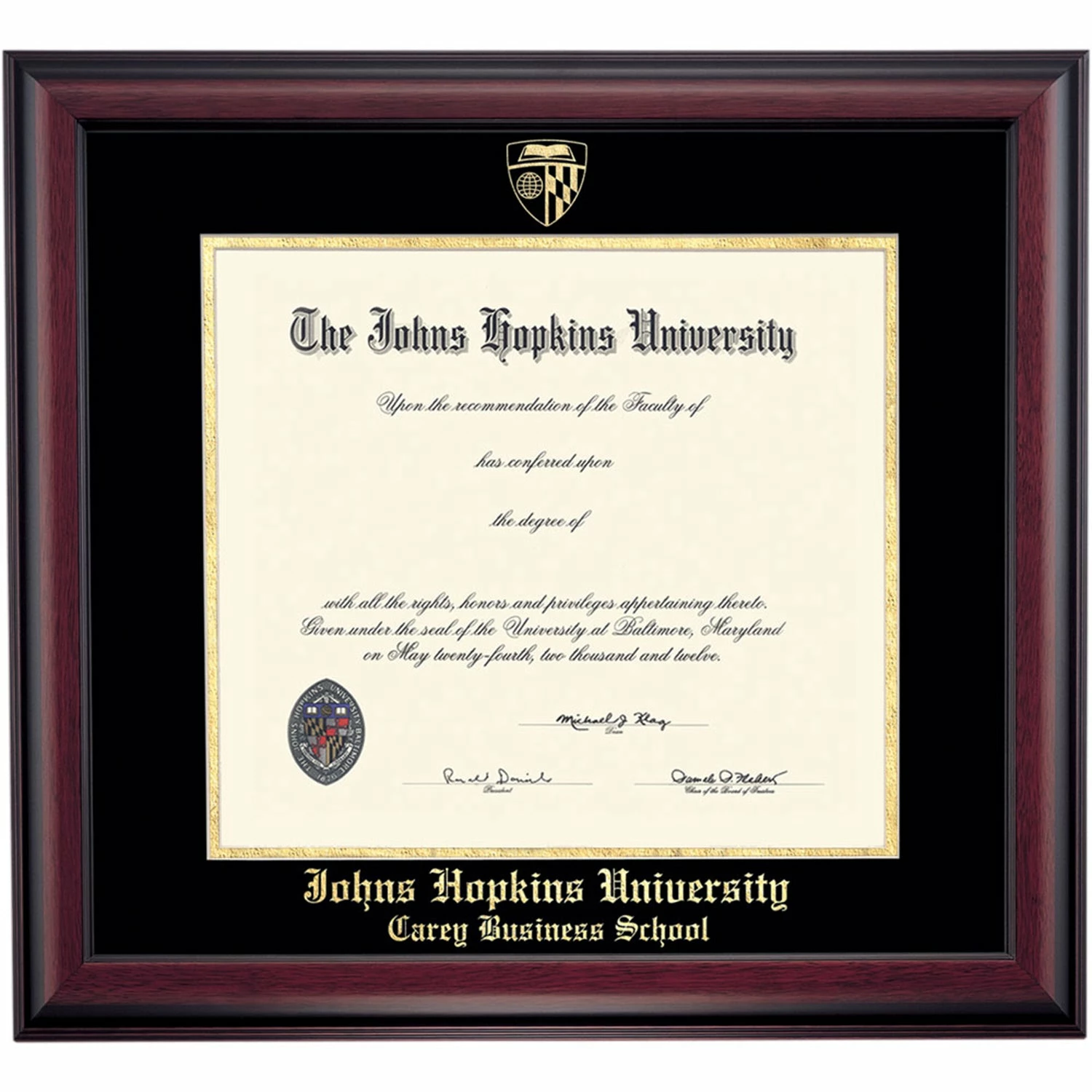 Celebrate your graduation in style with this handcrafted diploma frame. Custom crafted to fit your Johns Hopkins University Carey Business School diploma, this frame is embossed with your school name and seal and features Black/Gold accent matting and high quality hardwood moulding.