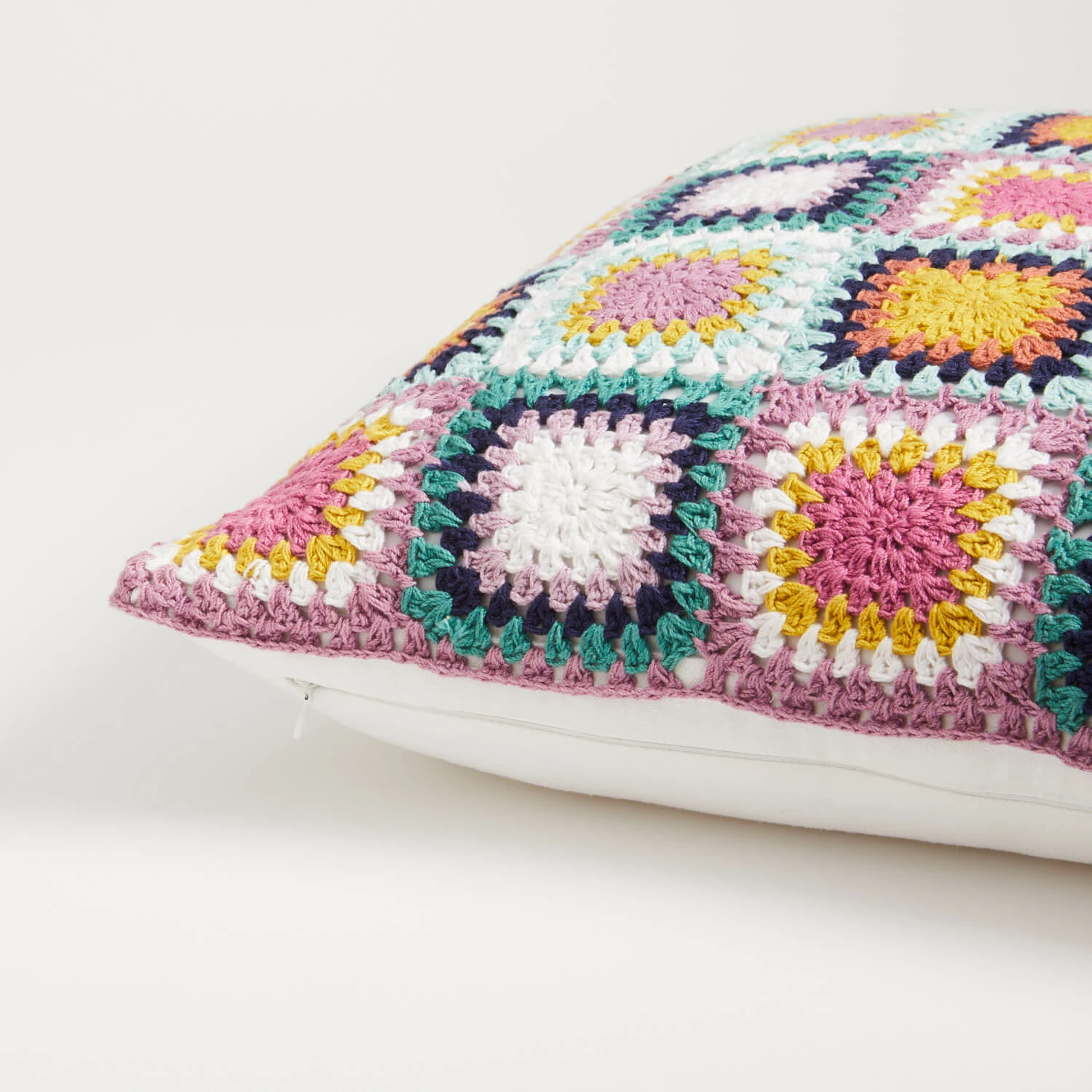 Add a homey vibe to your space with this delicate crochet-knit throw pillow. Includes the vintage-mod pillow cover and insert. Crochet front with solid cotton back.