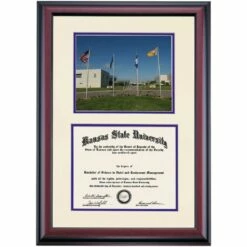 Celebrate your graduation in style with this handcrafted premier diploma frame which includes a Professional Photograph of the Salina Campus. Custom crafted to fit your Kansas State University diploma, this frame features accent matting and high quality hardwood moulding.