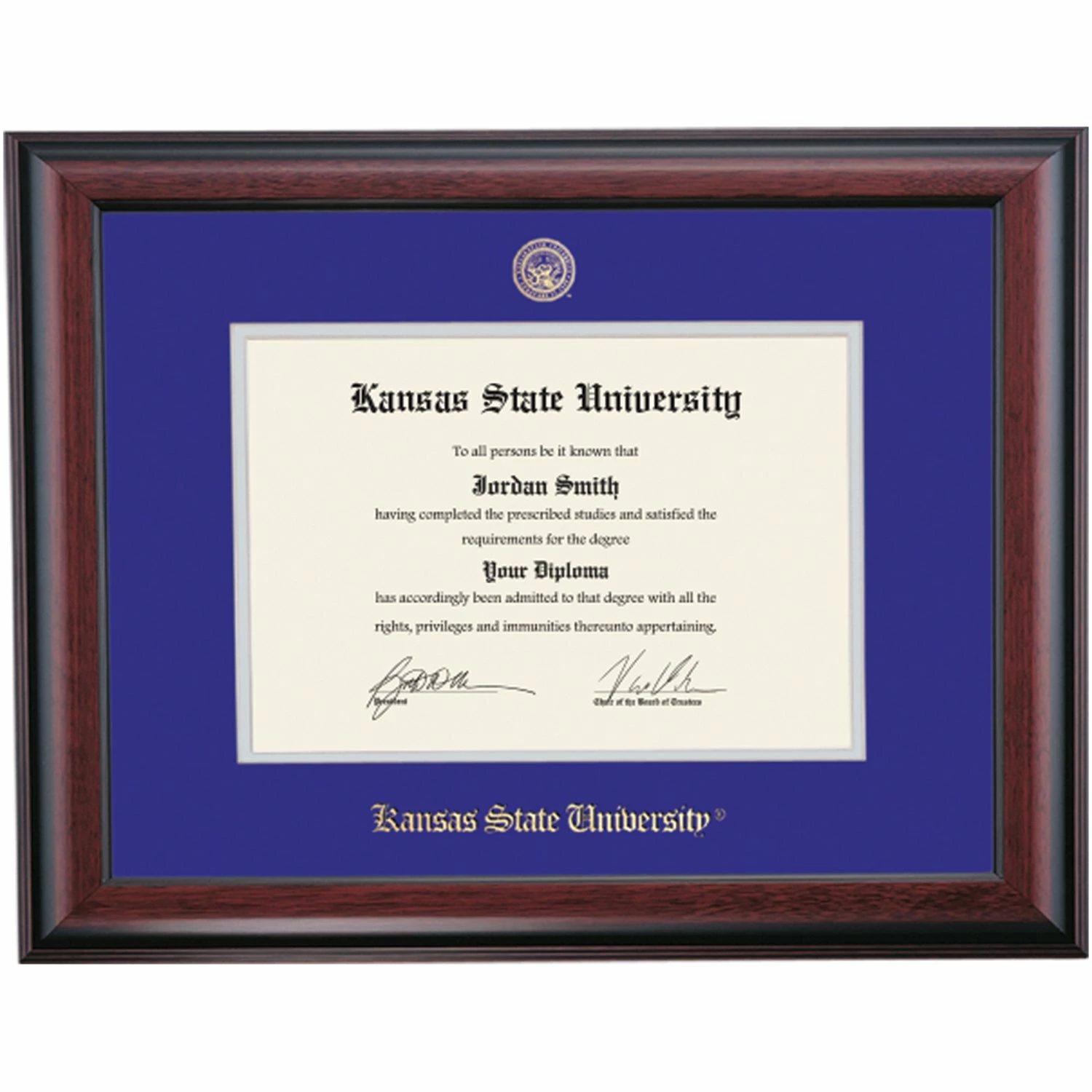 Celebrate your graduation in style with this handcrafted diploma frame. Custom crafted to fit your Kansas State University Veterinary diploma, this frame is embossed with your school name and seal and features Purple/Grey accent matting and high quality hardwood moulding.