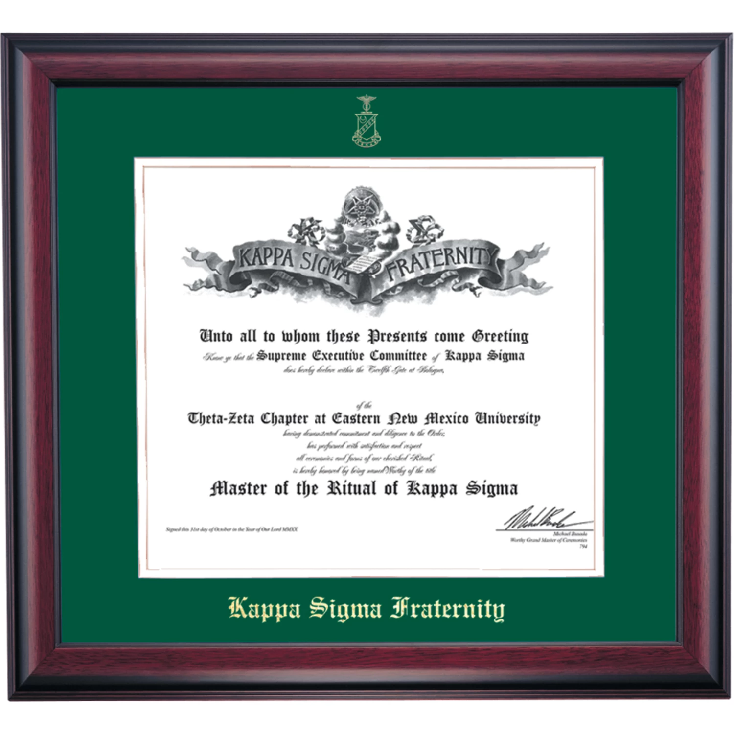Celebrate in style with this handcrafted certificate frame. Custom crafted to fit your Kappa Sigma Master of Ritual Certificate, this frame is embossed with the fraternity name and crest and features Green/White accent matting and high quality hardwood moulding.
