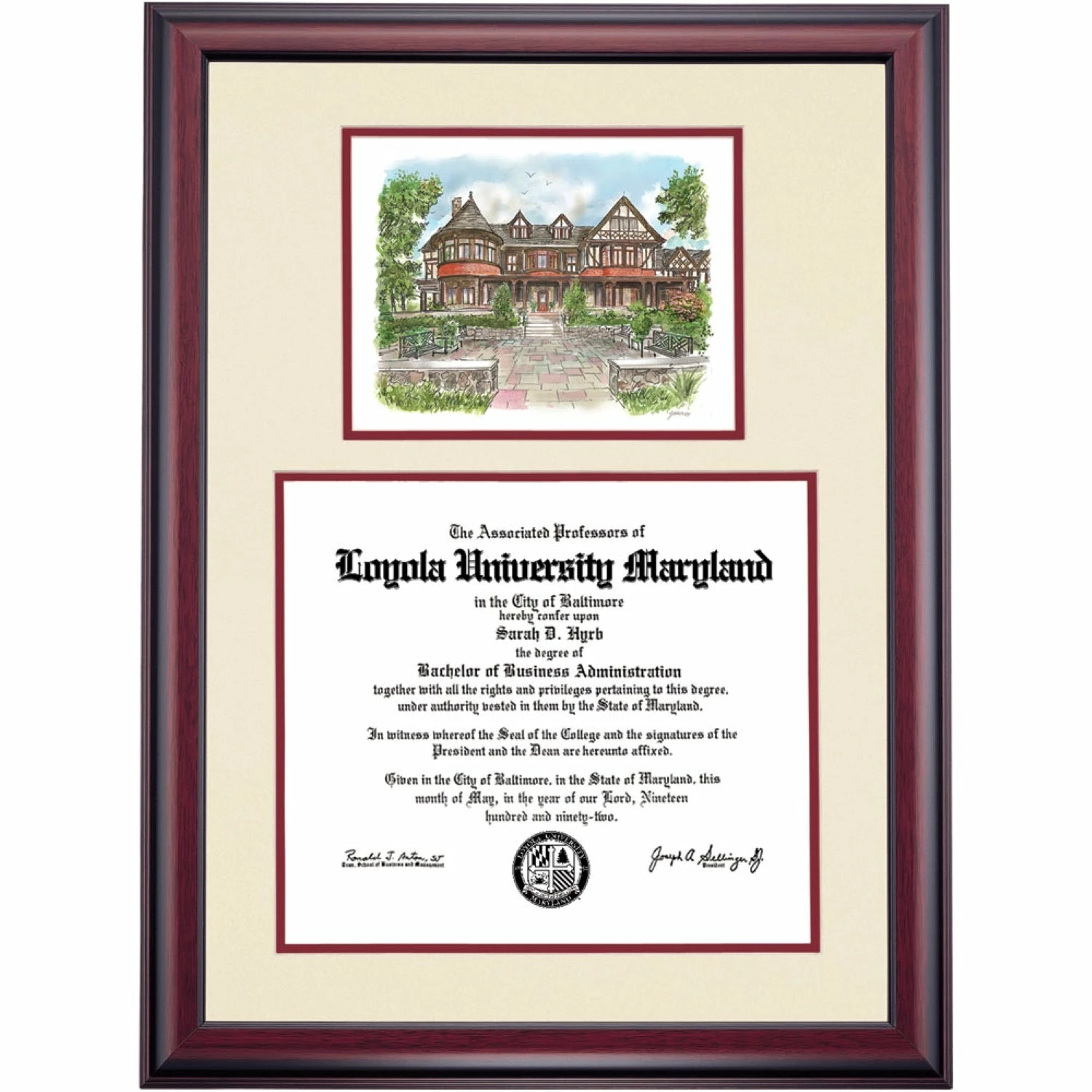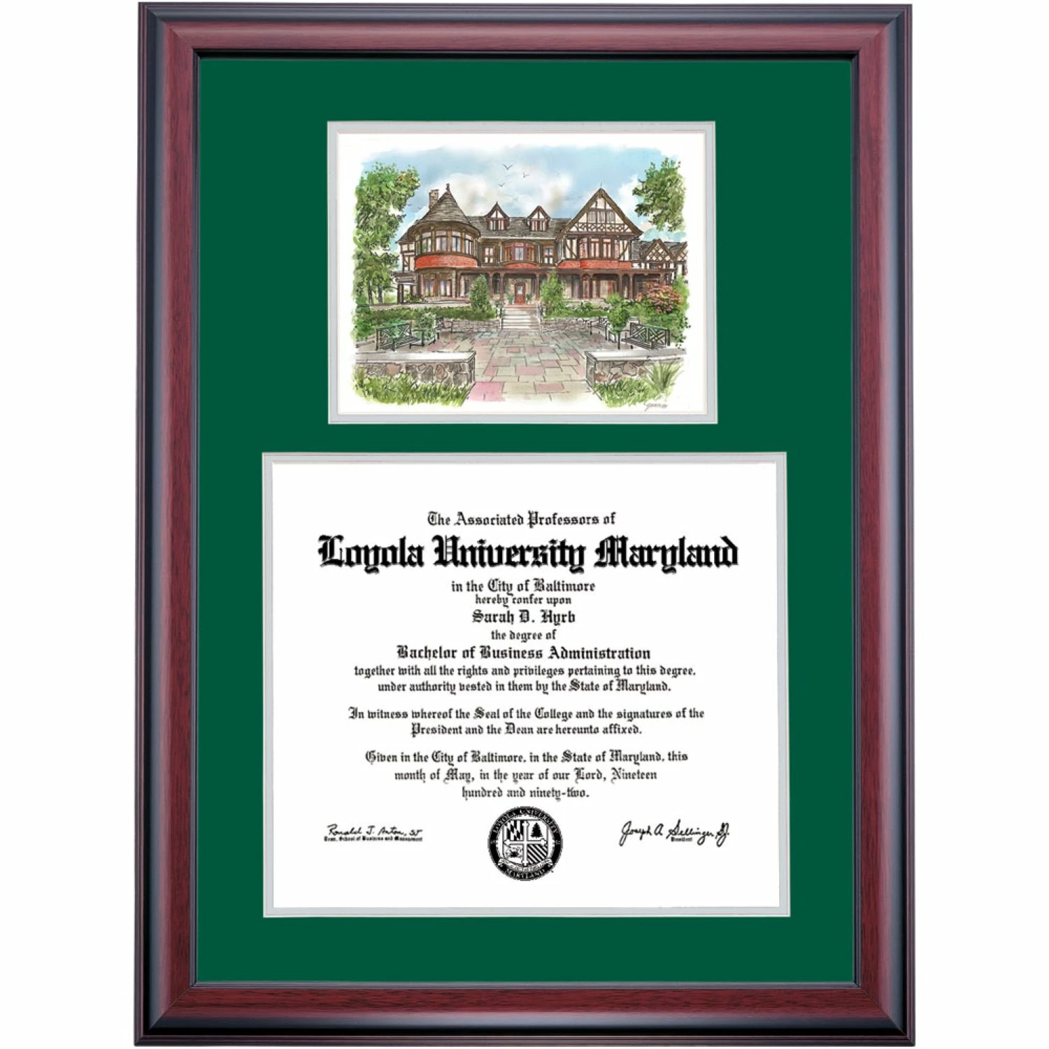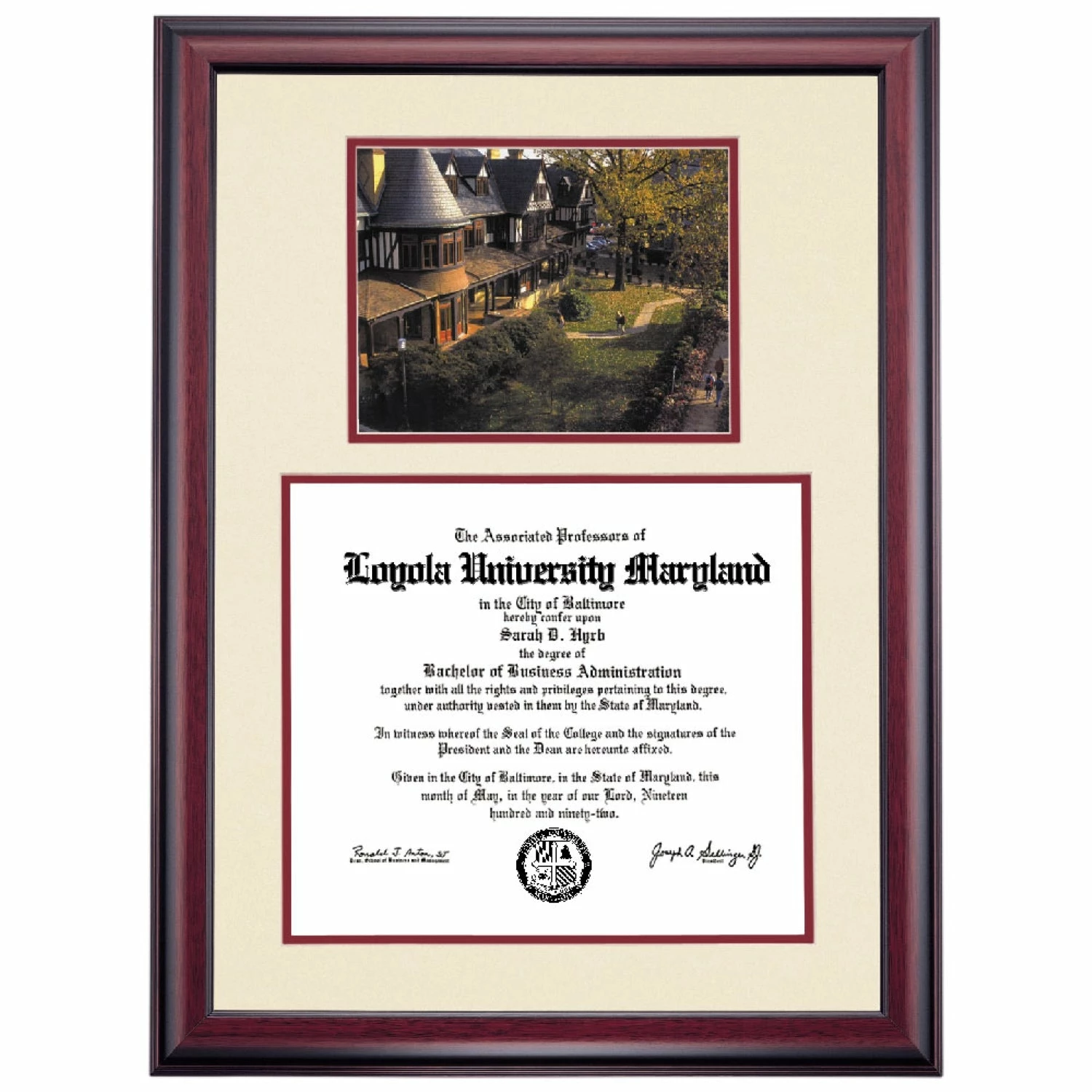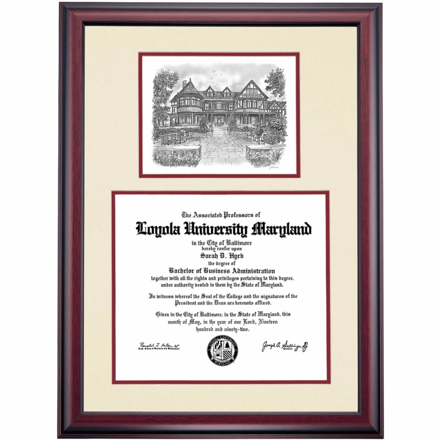 Celebrate your graduation in style with this handcrafted premier diploma frame which includes a Professional Print of the Humanities Building. Custom crafted to fit your Loyola University Maryland diploma, this frame features accent matting and high quality hardwood moulding.