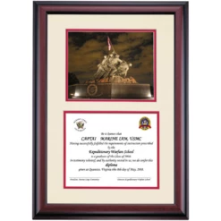 Celebrate your graduation in style with this handcrafted premier diploma frame which includes a Professional Photograph of the USMC War Memorial. Custom crafted to fit your Marine Corps University diploma, this frame features accent matting and high quality hardwood moulding.