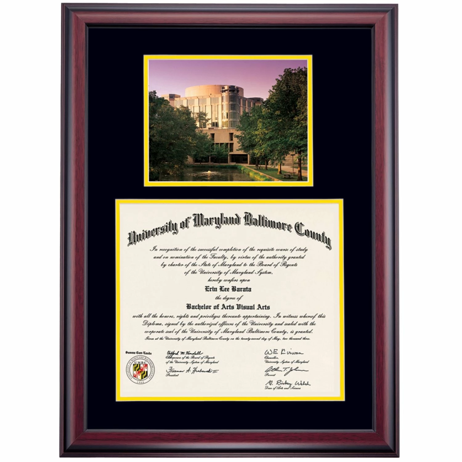 Celebrate your graduation in style with this handcrafted premier diploma frame which includes a Professional Print of the Albin O. Kuhn Library. Custom crafted to fit your University of Maryland-Baltimore County diploma, this frame features accent matting and high quality hardwood moulding.