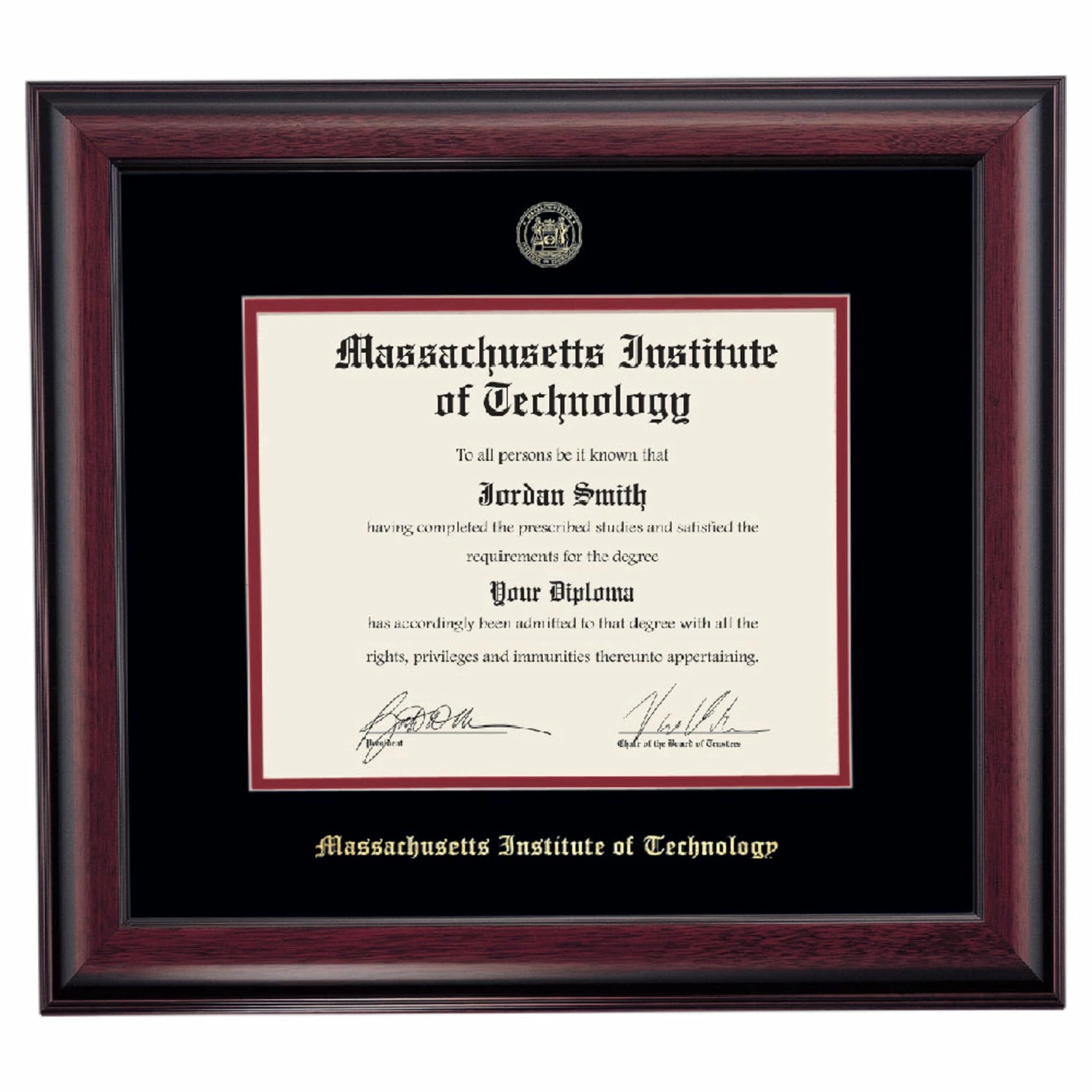 Celebrate your graduation in style with this handcrafted diploma frame. Custom crafted to fit your Massachusetts Institute of Technology diploma, this frame is embossed with your school name and seal and features Black/Maroon accent matting and high quality hardwood moulding.