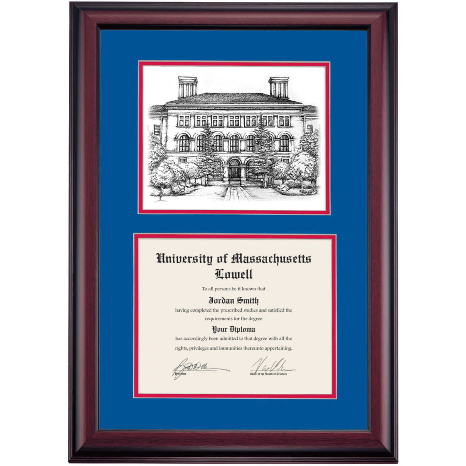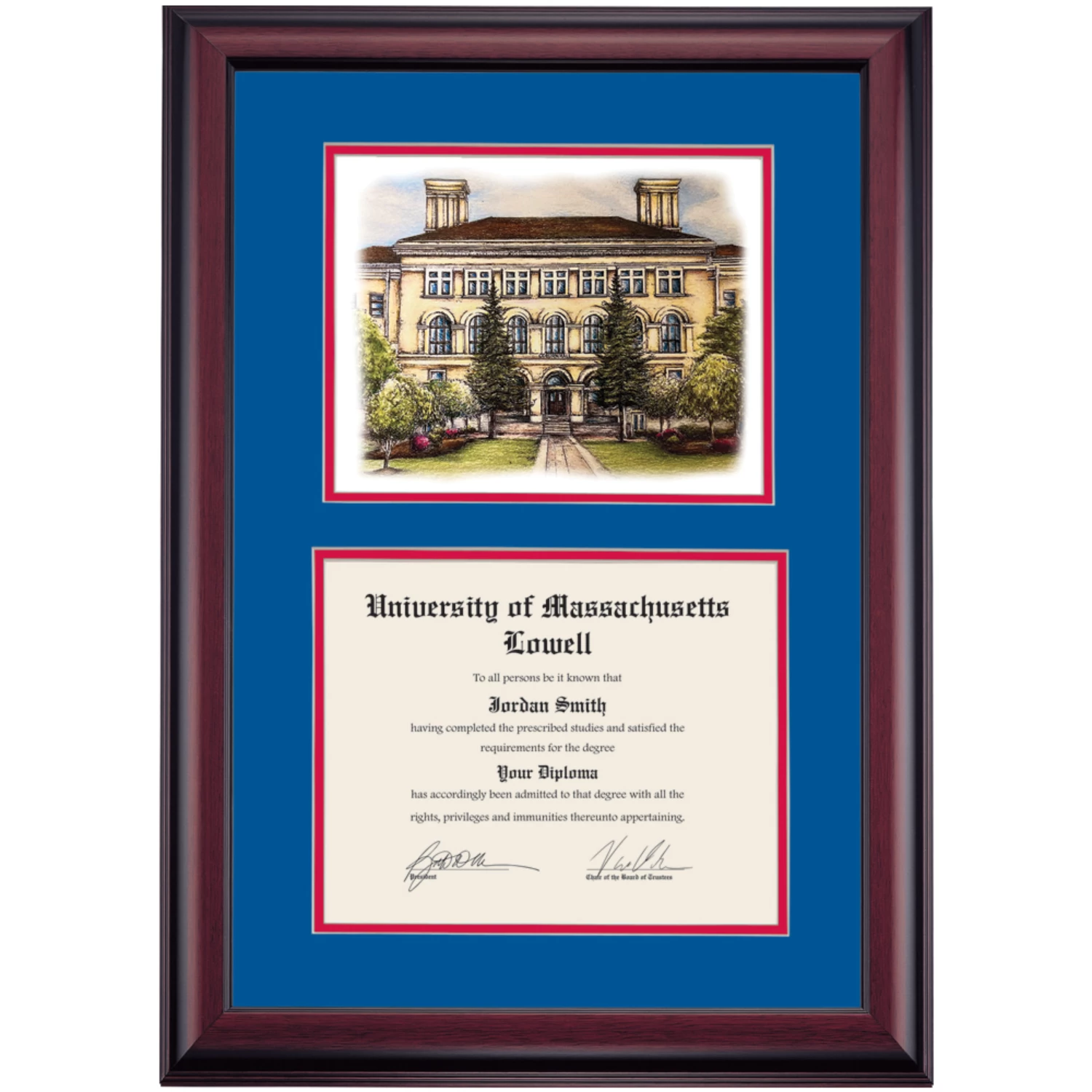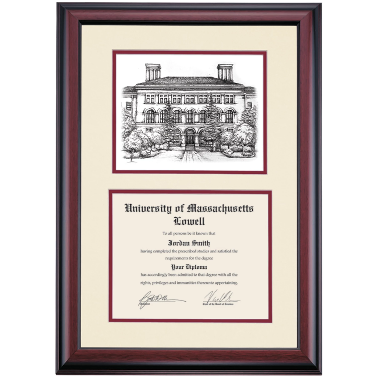 Celebrate your graduation in style with this handcrafted premier diploma frame which includes a Professional Print of Coburn Hall. Custom crafted to fit your University of Massachusetts Lowell diploma, this frame features accent matting and high quality hardwood moulding.