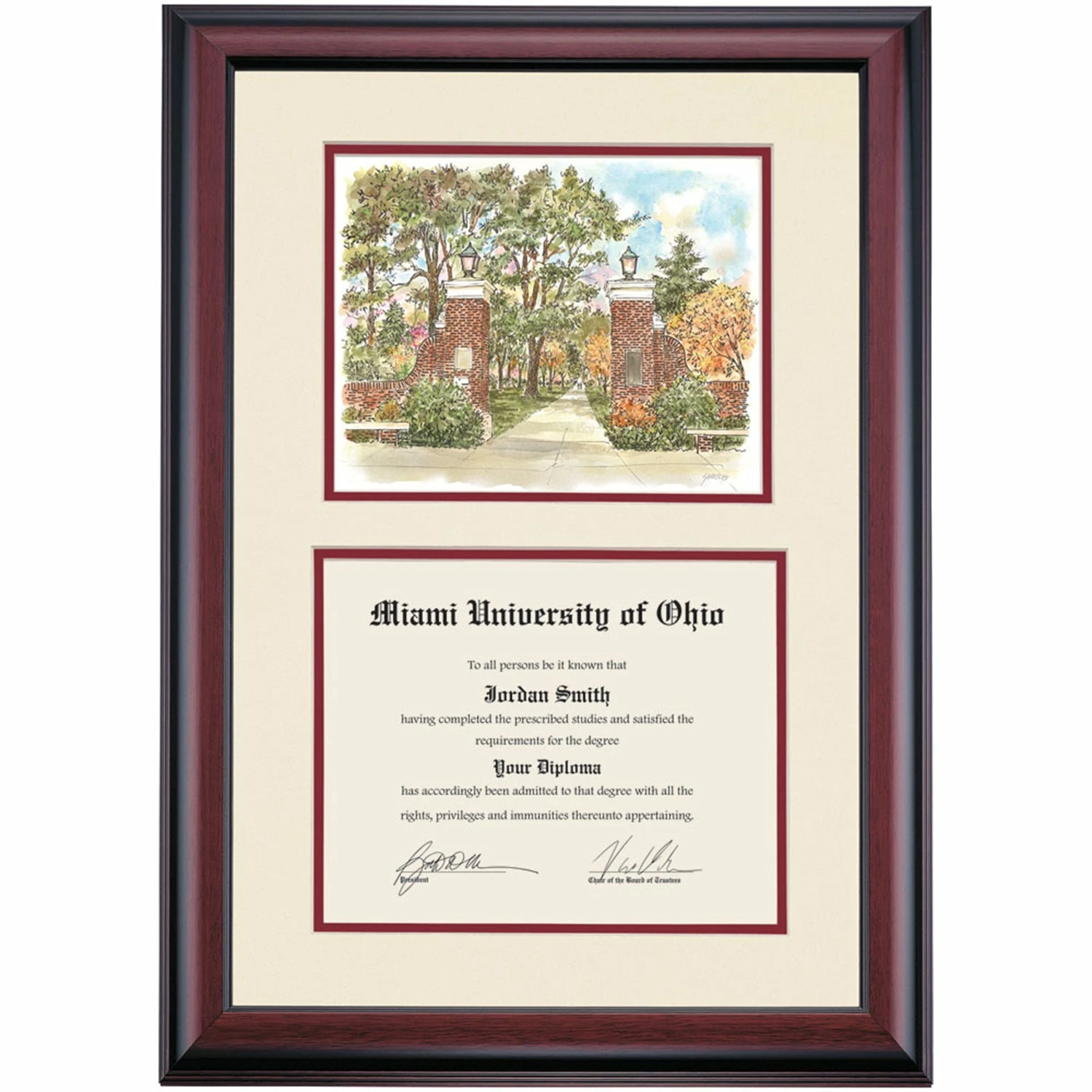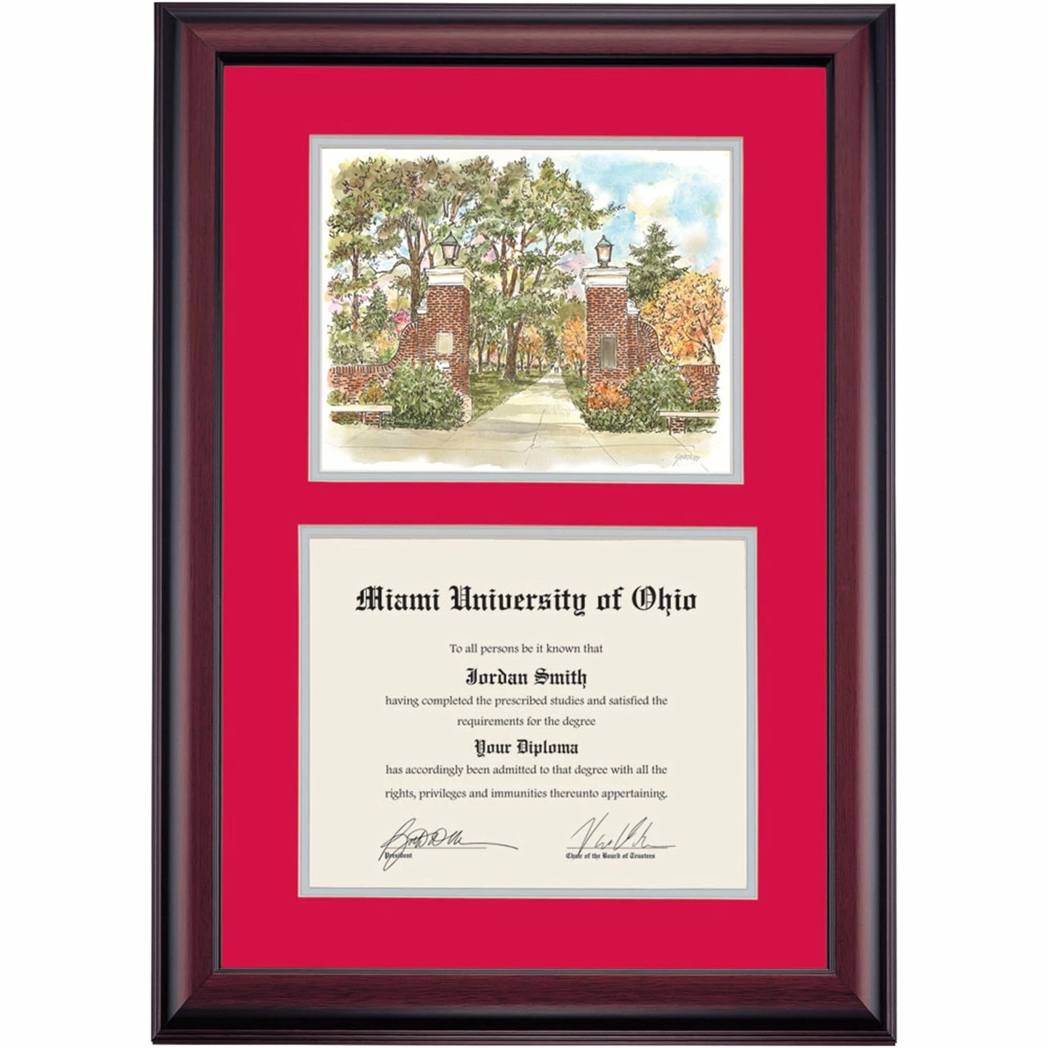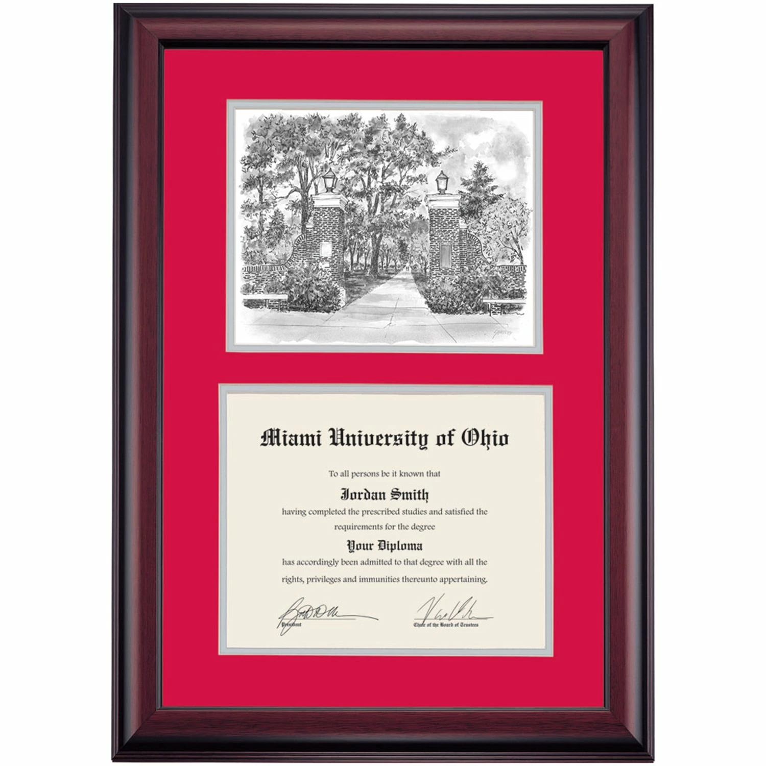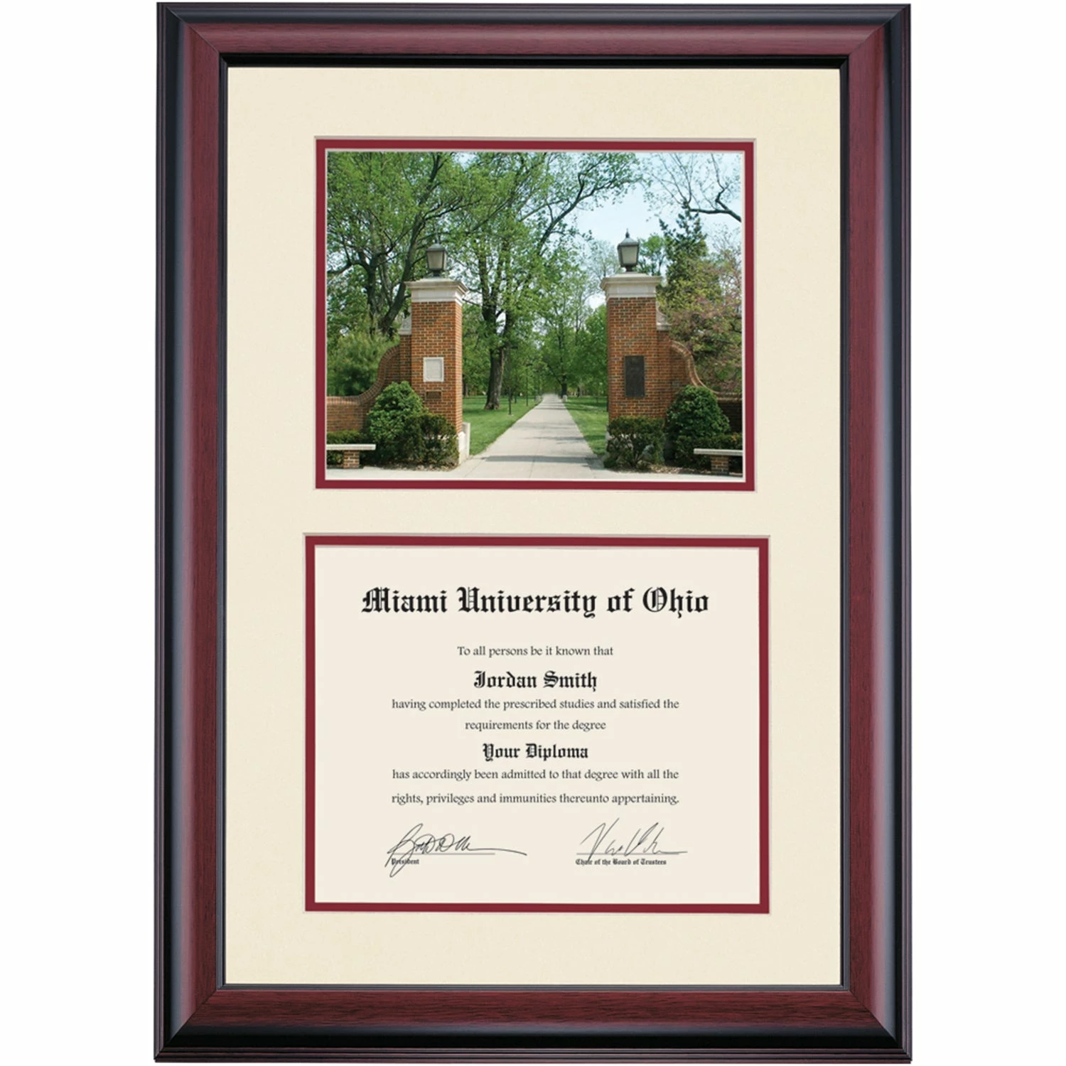 Celebrate your graduation in style with this handcrafted premier diploma frame which includes a Professional Print of Slant Walk. Custom crafted to fit your Miami University of Ohio diploma, this frame features accent matting and high quality hardwood moulding.