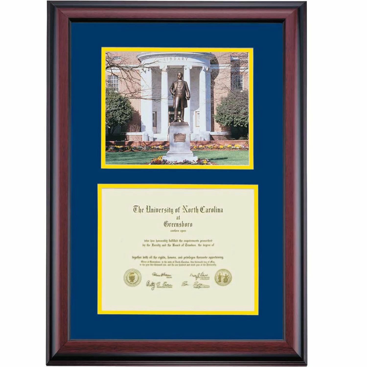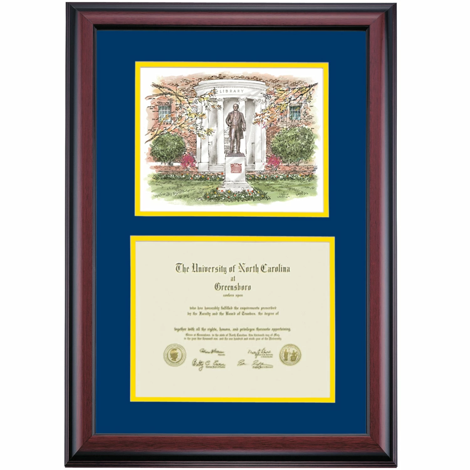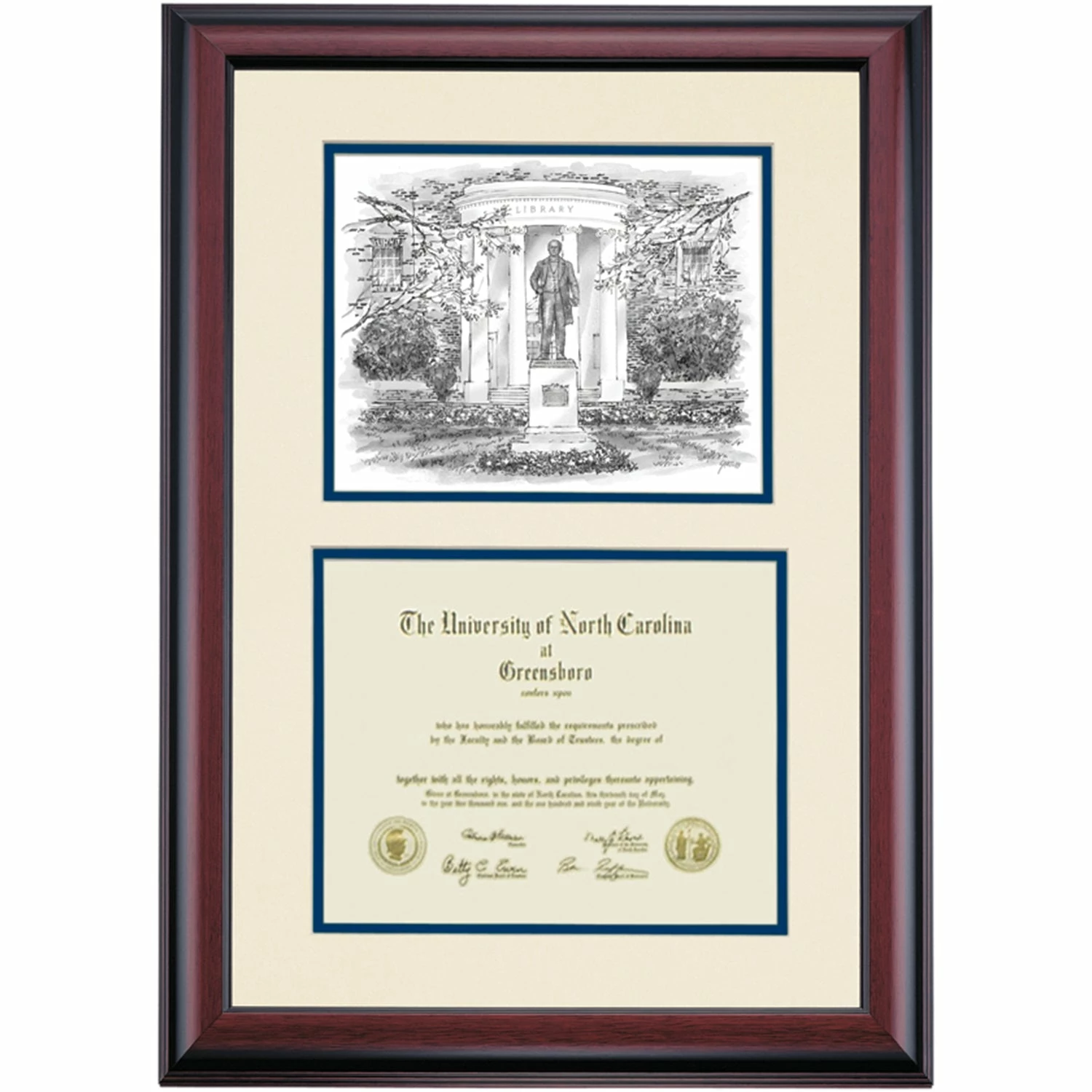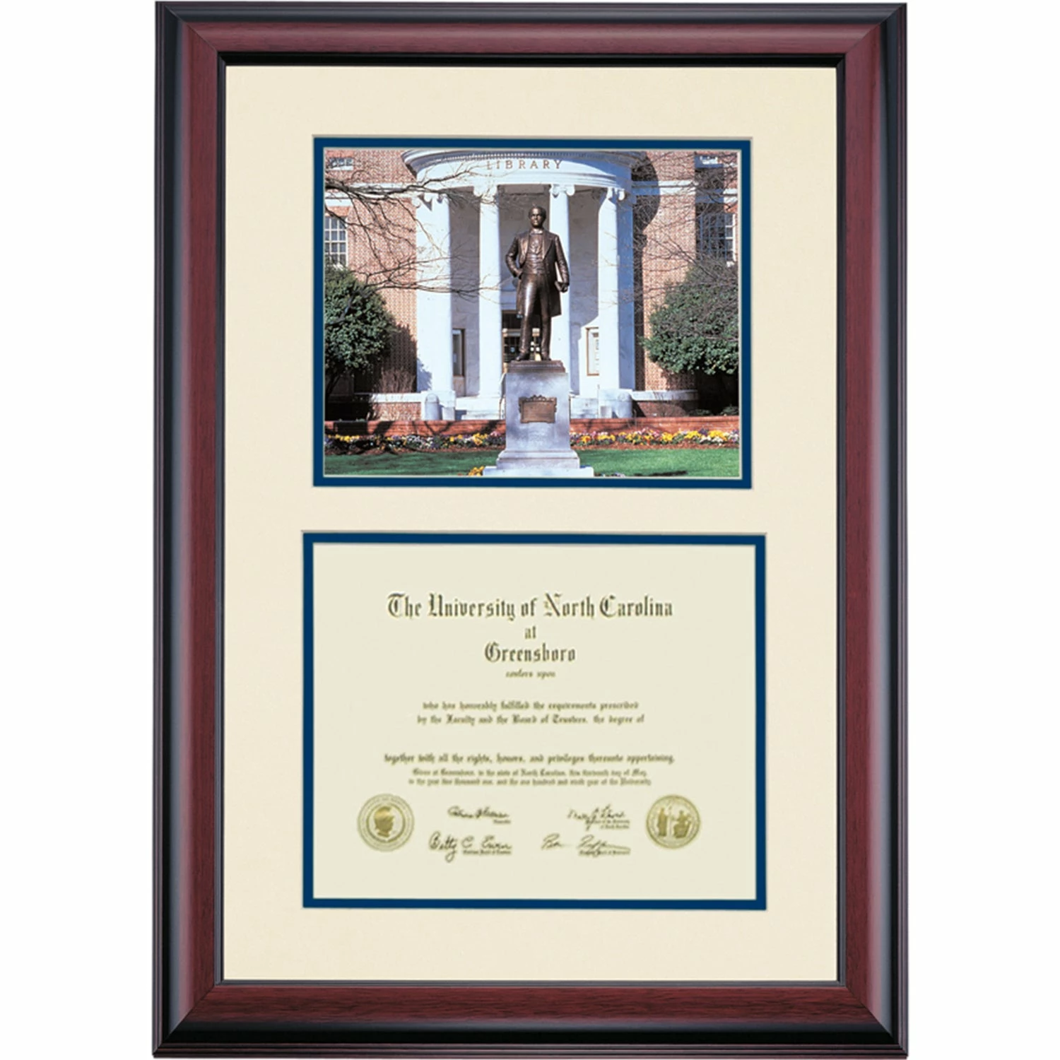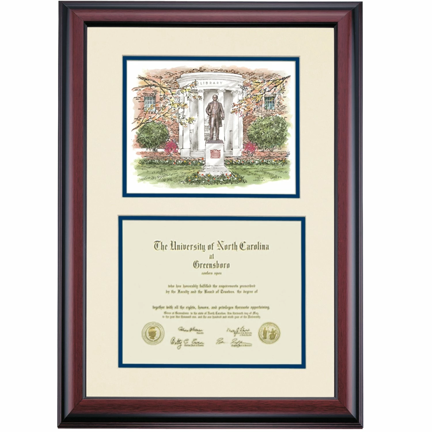 Celebrate your graduation in style with this handcrafted premier diploma frame which includes a Professional Print of the Charles Duncan McIver Statue. Custom crafted to fit your University of North Carolina-Greensboro diploma, this frame features accent matting and high quality hardwood moulding.