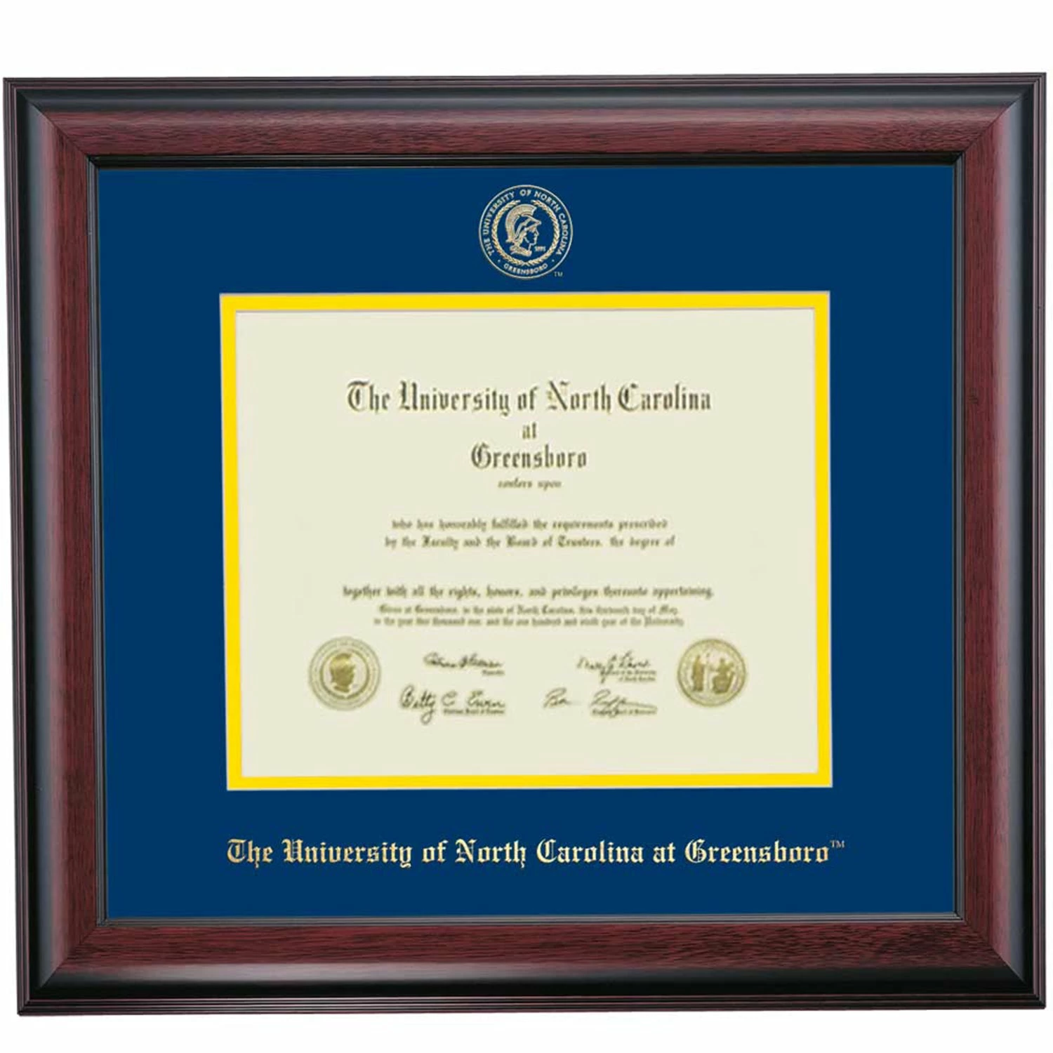 Celebrate your graduation in style with this handcrafted diploma frame. Custom crafted to fit your University of North Carolina-Greensboro diploma, this frame is embossed with your school name and seal and features Navy/Yellow accent matting and high quality hardwood moulding.