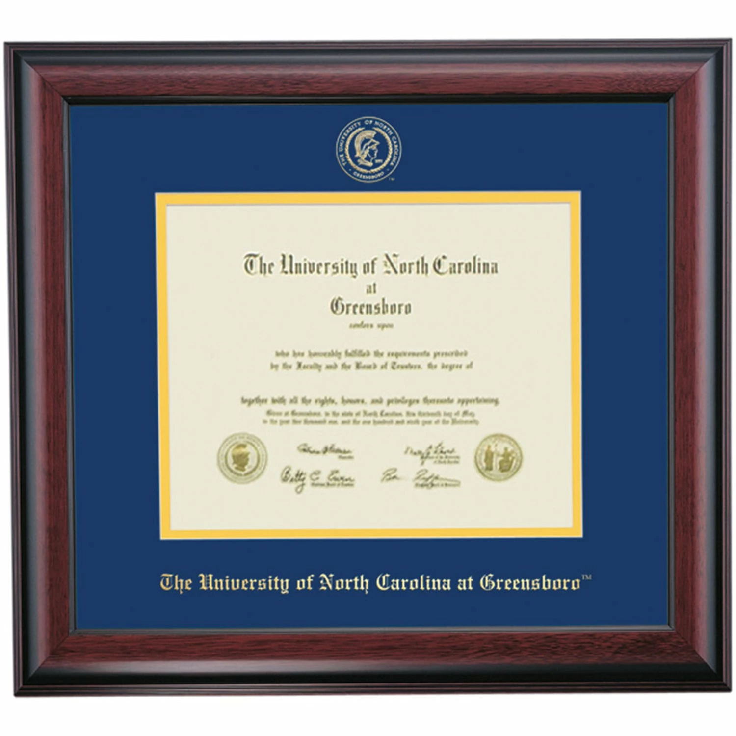 Celebrate your graduation in style with this handcrafted diploma frame. Custom crafted to fit your University of North Carolina-Greensboro Graduate diploma, this frame is embossed with your school name and seal and features Navy/Yellow accent matting and high quality hardwood moulding.