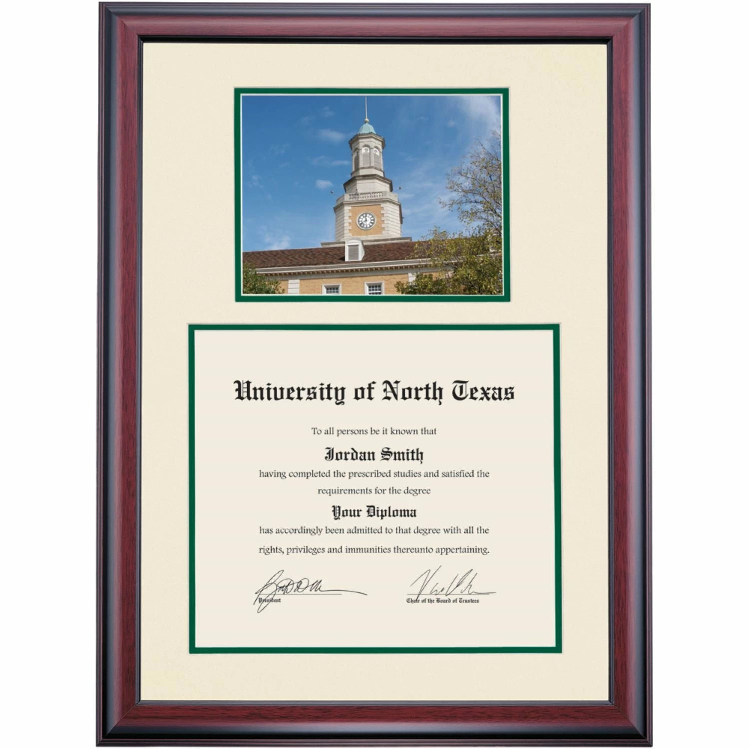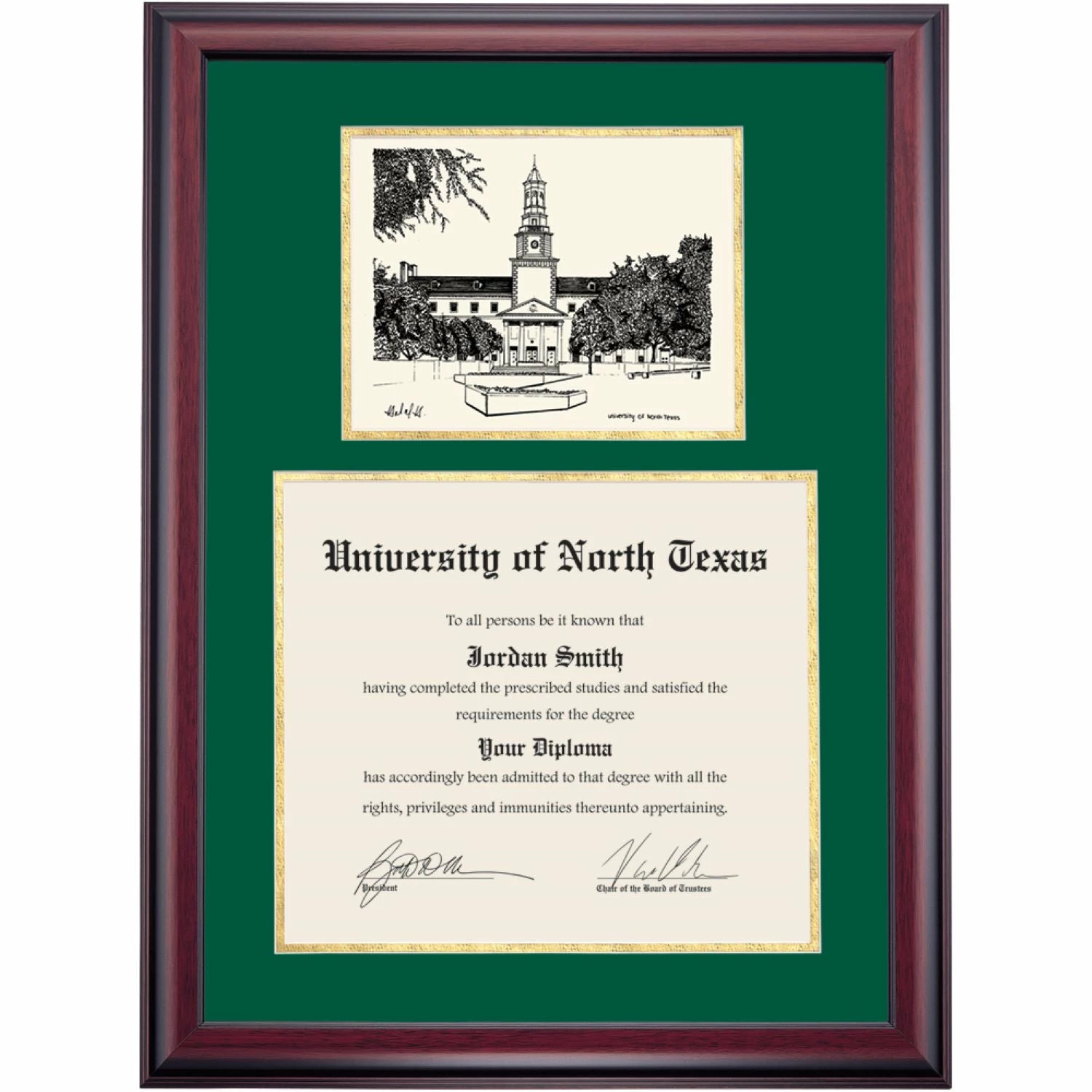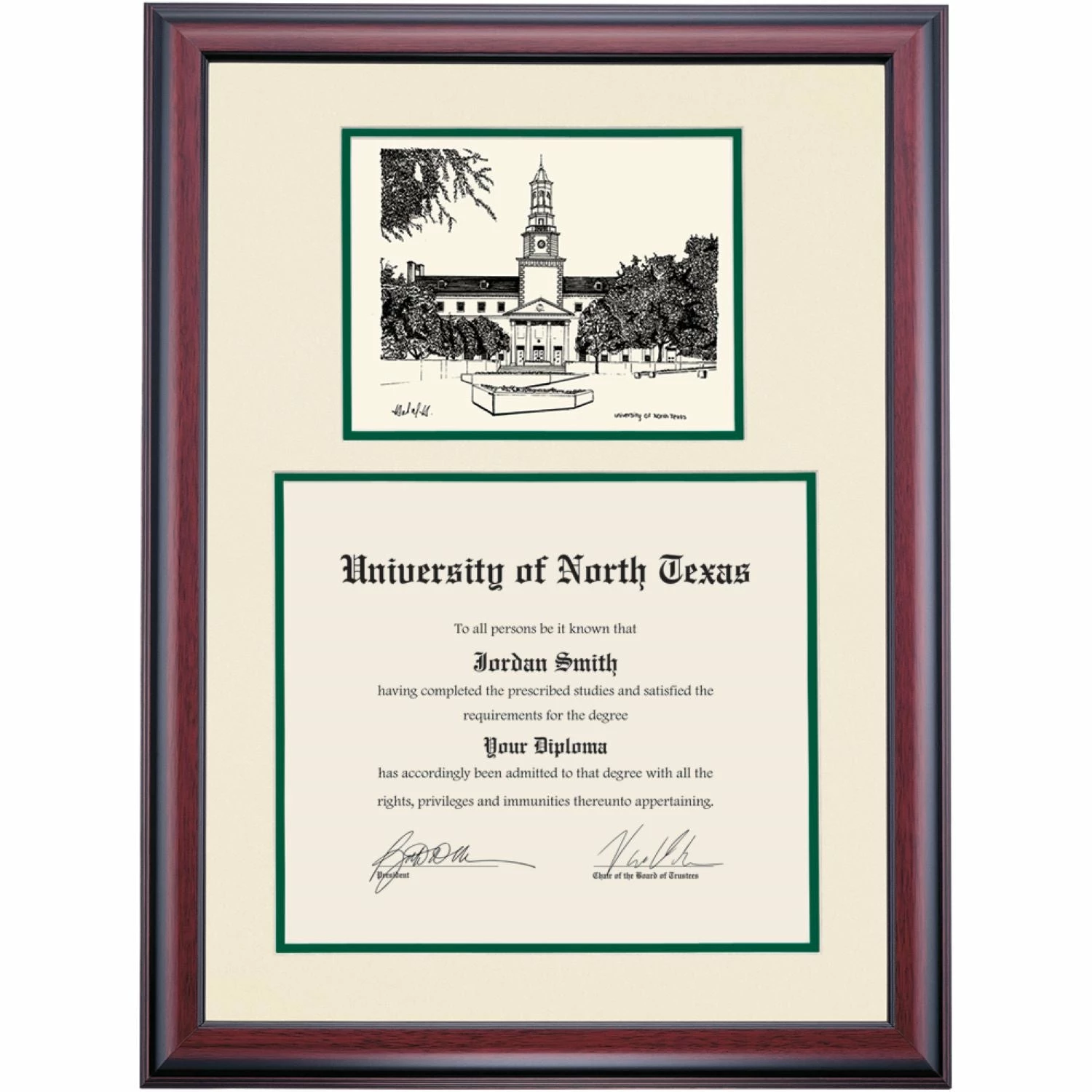 Celebrate your graduation in style with this handcrafted premier diploma frame which includes a Professional Print of the Hurley Administration Building. Custom crafted to fit your University of North Texas diploma, this frame features accent matting and high quality hardwood moulding.