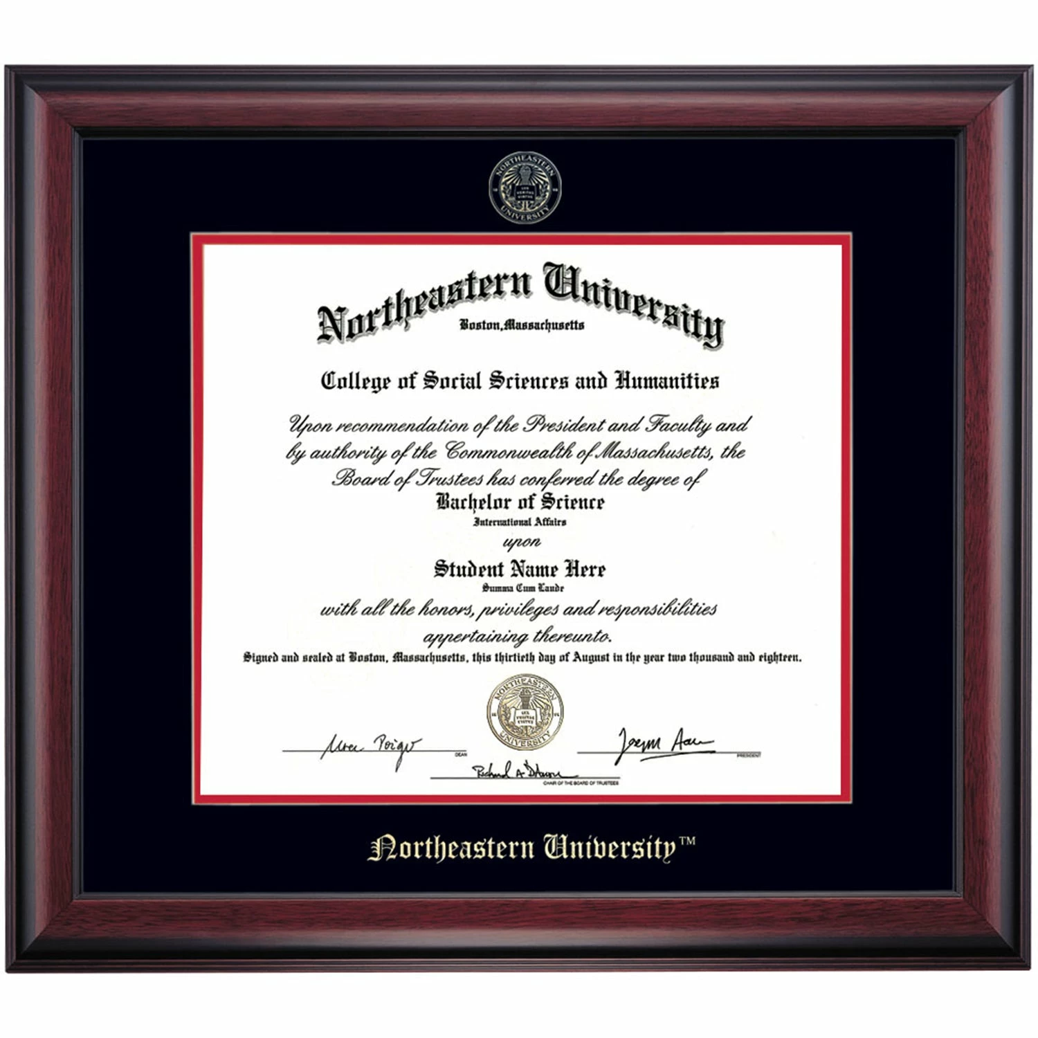 Celebrate your graduation in style with this handcrafted diploma frame. Custom crafted to fit your Northeastern University diploma, this frame is embossed with your school name and seal and features Black/Cherry accent matting and high quality hardwood moulding.