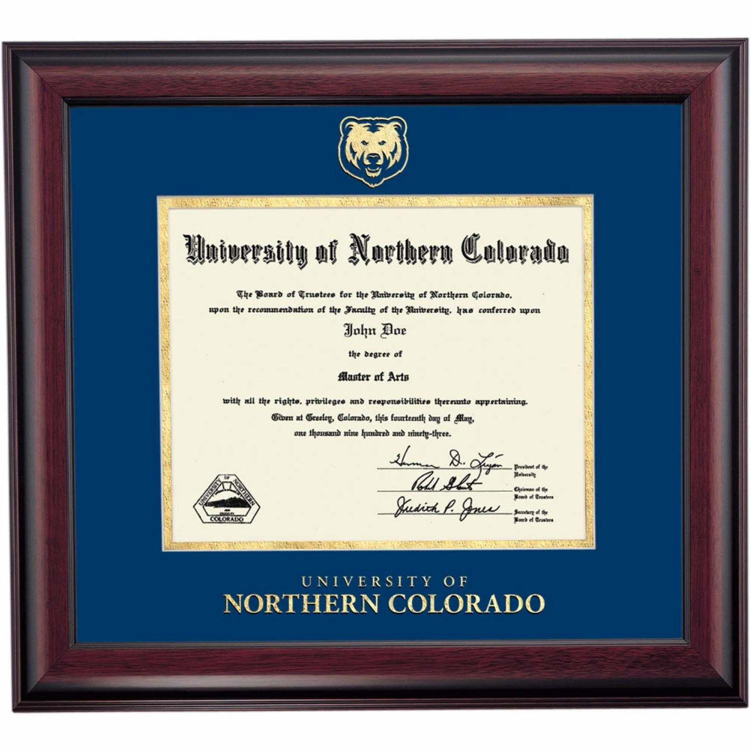Celebrate your graduation in style with this handcrafted diploma frame. Custom crafted to fit your University of Nothern Colorado diploma, this frame is embossed with your school name and seal and features Navy/Gold accent matting and high quality hardwood moulding.