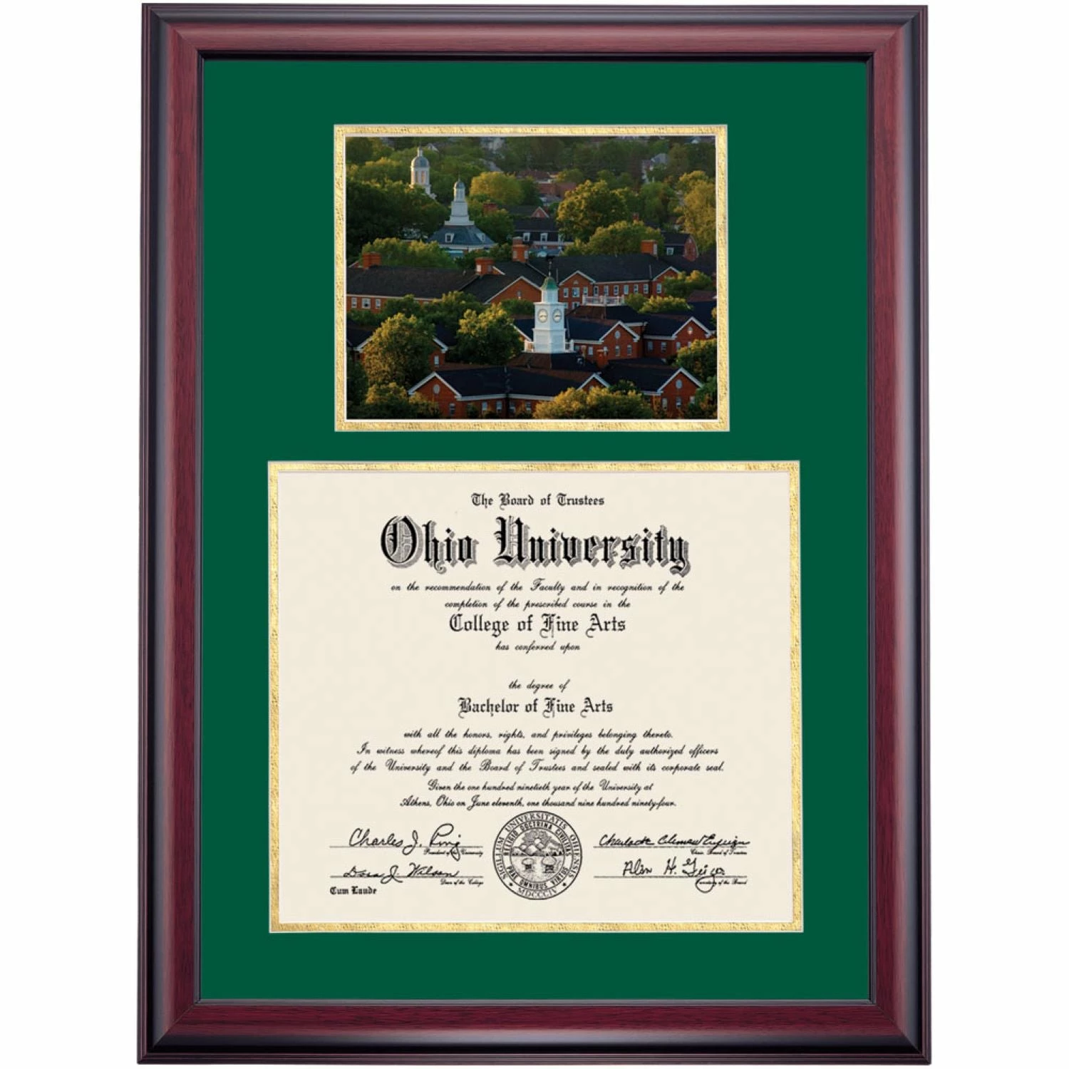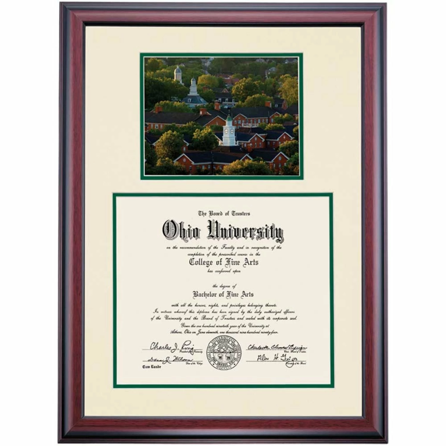 Celebrate your graduation in style with this handcrafted premier diploma frame which includes a Professional Photograph of South Green. Custom crafted to fit your Ohio University diploma, this frame features accent matting and high quality hardwood moulding.