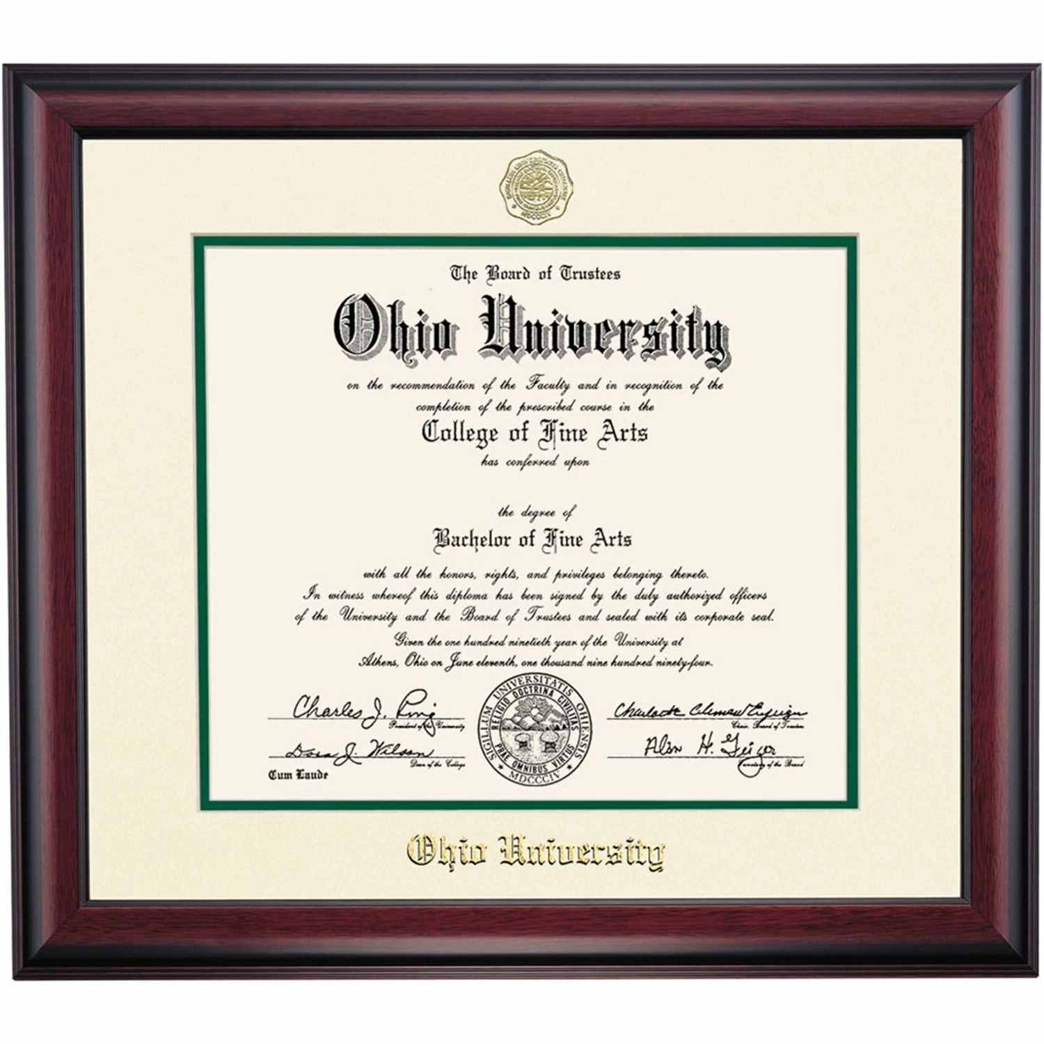 Celebrate your graduation in style with this handcrafted diploma frame. Custom crafted to fit your Ohio University diploma, this frame is embossed with your school name and seal and features Hunter accent matting and high quality hardwood moulding.