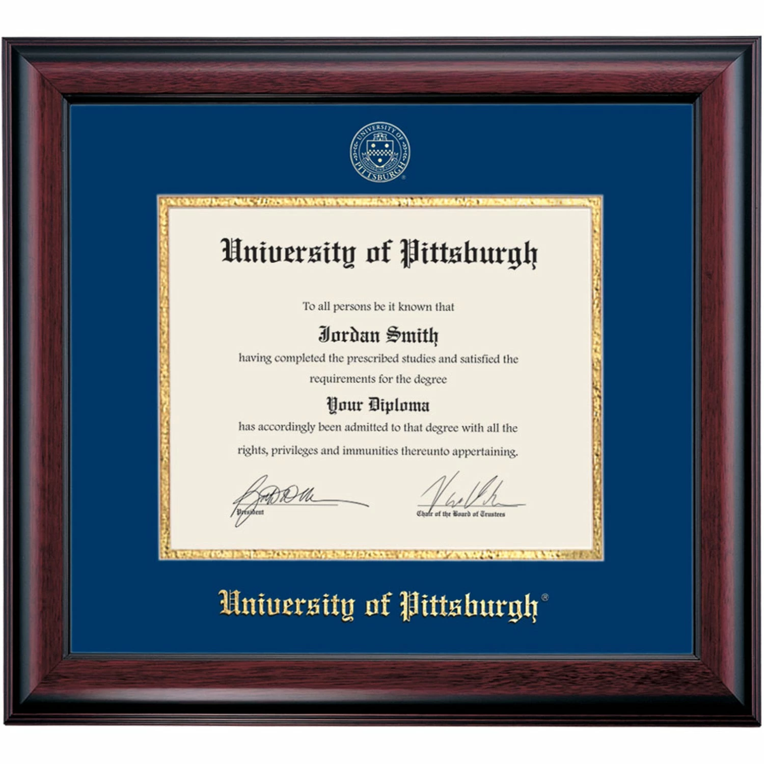 Celebrate your graduation in style with this handcrafted diploma frame. Custom crafted to fit your University of Pittsburgh diploma, this frame is embossed with your school name and seal and features Navy/Gold accent matting and high quality hardwood moulding.
