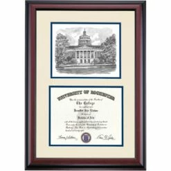 Celebrate your graduation in style with this handcrafted premier diploma frame which includes a Professional Print of Rush Rhees Library. Custom crafted to fit your University of Rochester diploma, this frame features accent matting and high quality hardwood moulding.